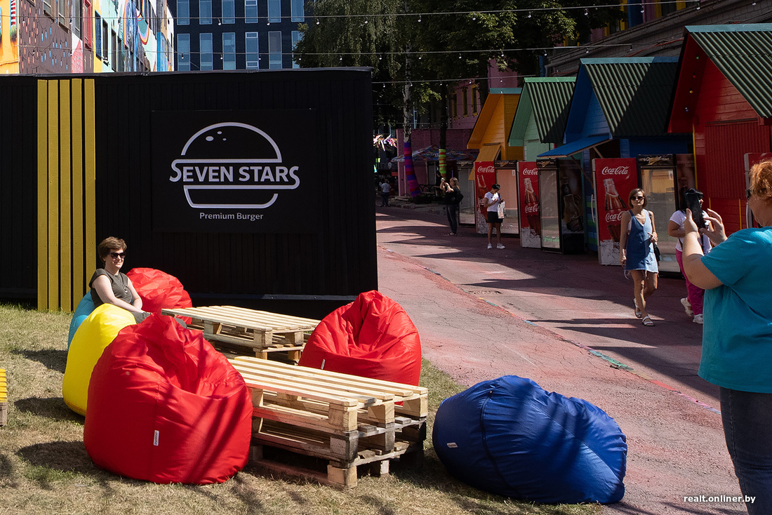 На улице плюс 26, август в самом разгаре, и минчанам хочется каких-то развлекух. Наверное, именно потому в рабочее время буднего дня немало людей пришли на новую гастроулицу, которая заработала сегодня в тестовом режиме во дворике завода «Луч». Название локации говорящее и очевидно отсылающее к часовому бренду — «Лучшая улица». Сходили, оценили ситуацию и рассказываем, что там сегодня можно поесть и как развлечься.