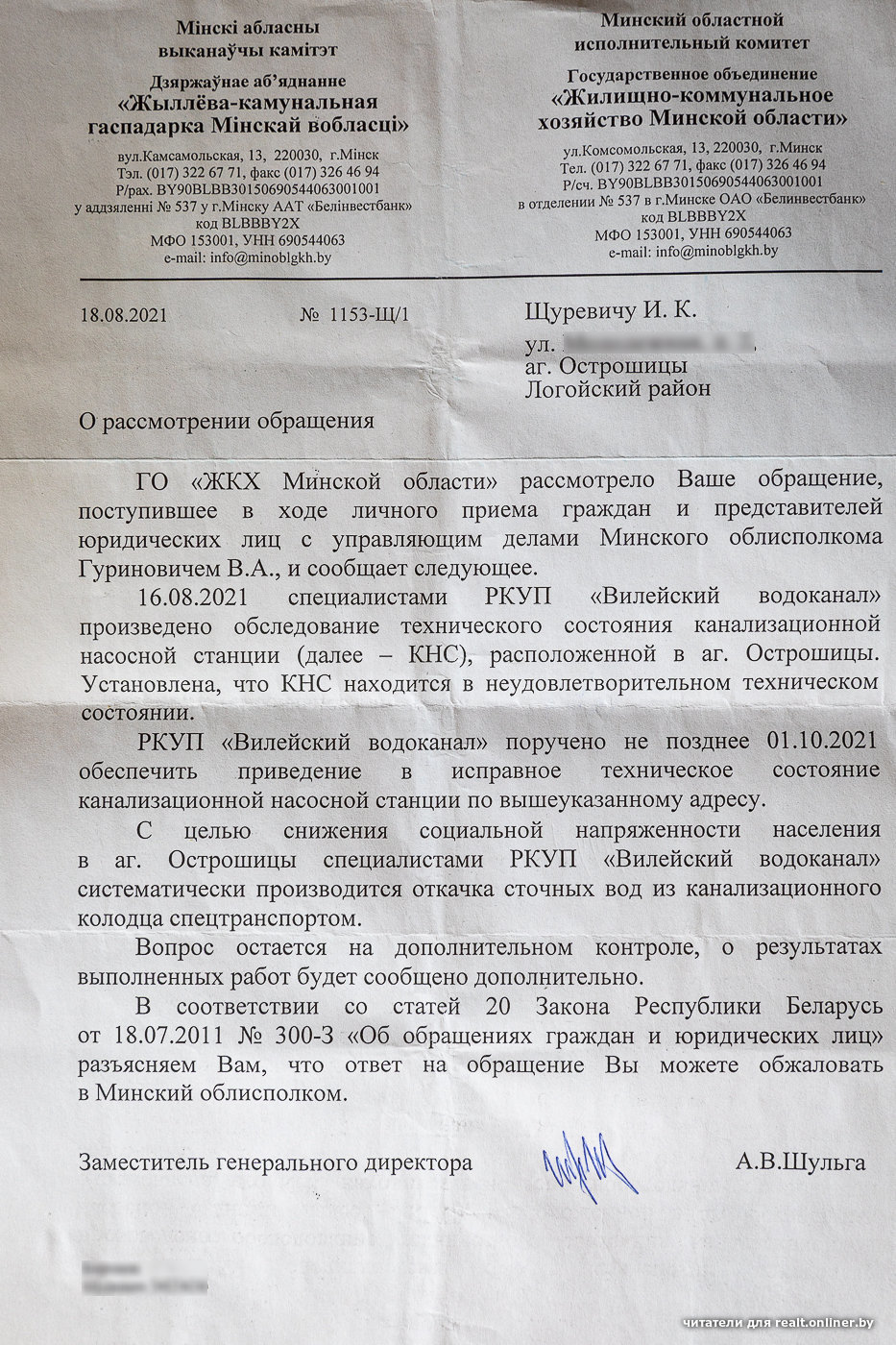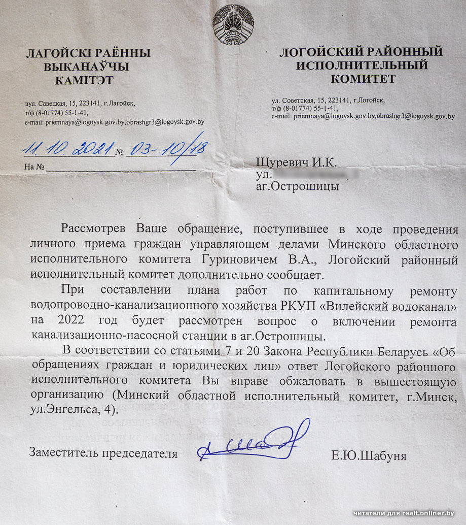 В письме из Логойского райисполкома, пришедшем уже в октябре 2021-го, обещали рассмотреть вопрос о включении ремонта канализационно-насосной станции в планы на 2022-й.