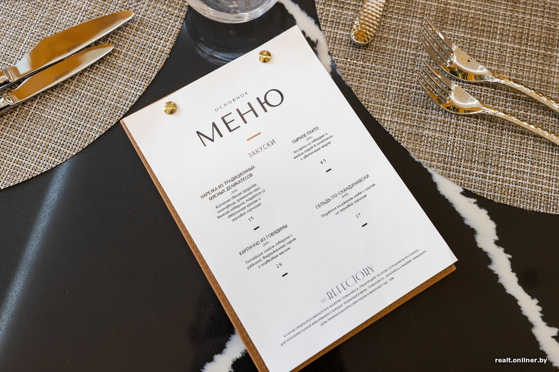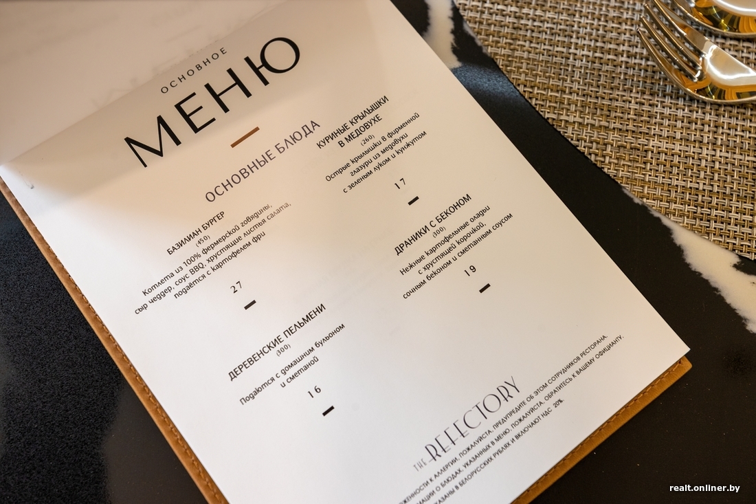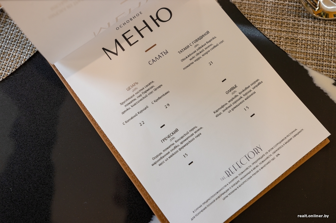В меню — блюда европейской кухни и немного белорусской в авторском прочтении. Цены такие: за супы попросят 11—16 рублей, за салаты — 15—29 рублей (ох уж этот цезарь с креветками!), за горячее — 16—27 рублей.