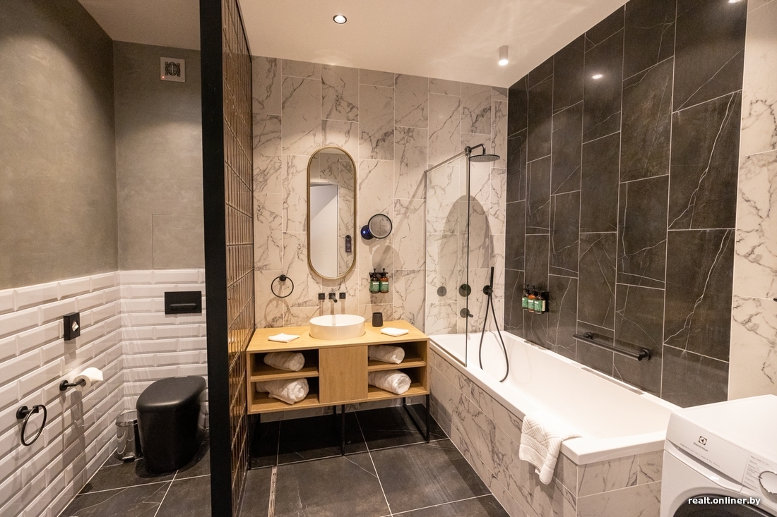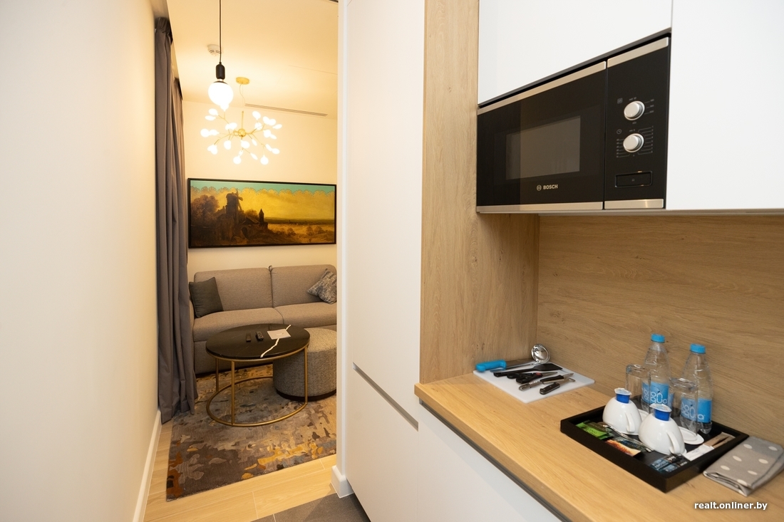 Например, в однокомнатных номерах кухня оборудована только микроволновкой, холодильником и электрочайником. В апартаментах к ним добавляется варочная панель, духовка, посудомойка и даже капсульная кофемашина. А в двухспальных, помимо этого, предусмотрена отдельная гардеробная и несколько санузлов.