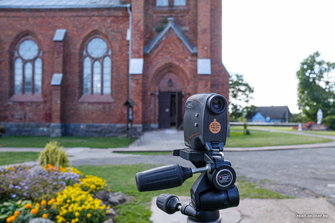 Инструмент попроще — дальномер ME 100. Считай, лазерная рулетка: ей мы для интереса измеряли высоту помещений внутри костелов. Прибор посерьезнее — TruPulse 200L. С его помощью измеряли костелы во весь рост. Принцип такой. С одного места нужно трижды прицелиться из монокуляра: перпендикулярно к костелу, а еще к уровню пола и наверх, к кресту. Прибор использует эти расстояния, чтобы вычислить высоту.