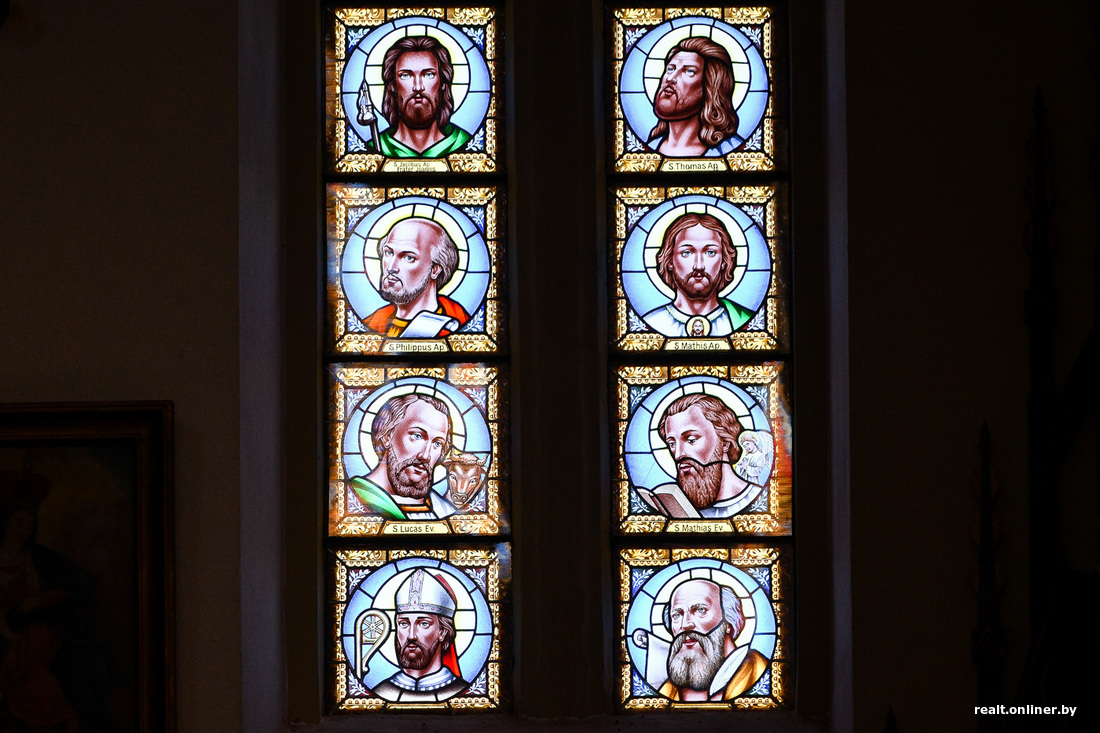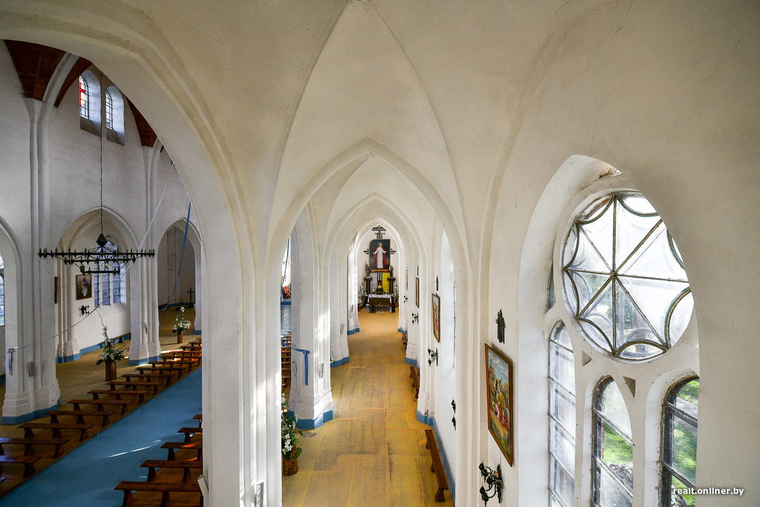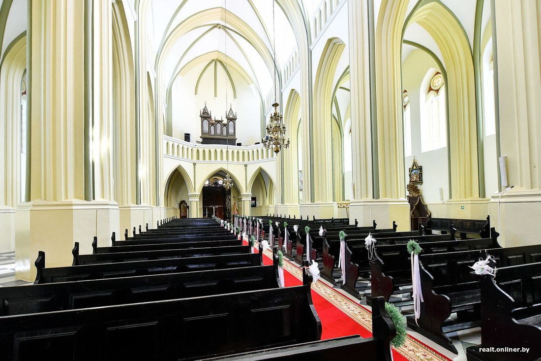 Внутри костела мы тоже походили с дальномером. Лазерная рулетка показала 18 метров 42 сантиметра — от уровня основного пола до самой высокой точки свода. И 18 метров 20 сантиметров — от уровня пола у алтаря, который находится на небольшом возвышении.