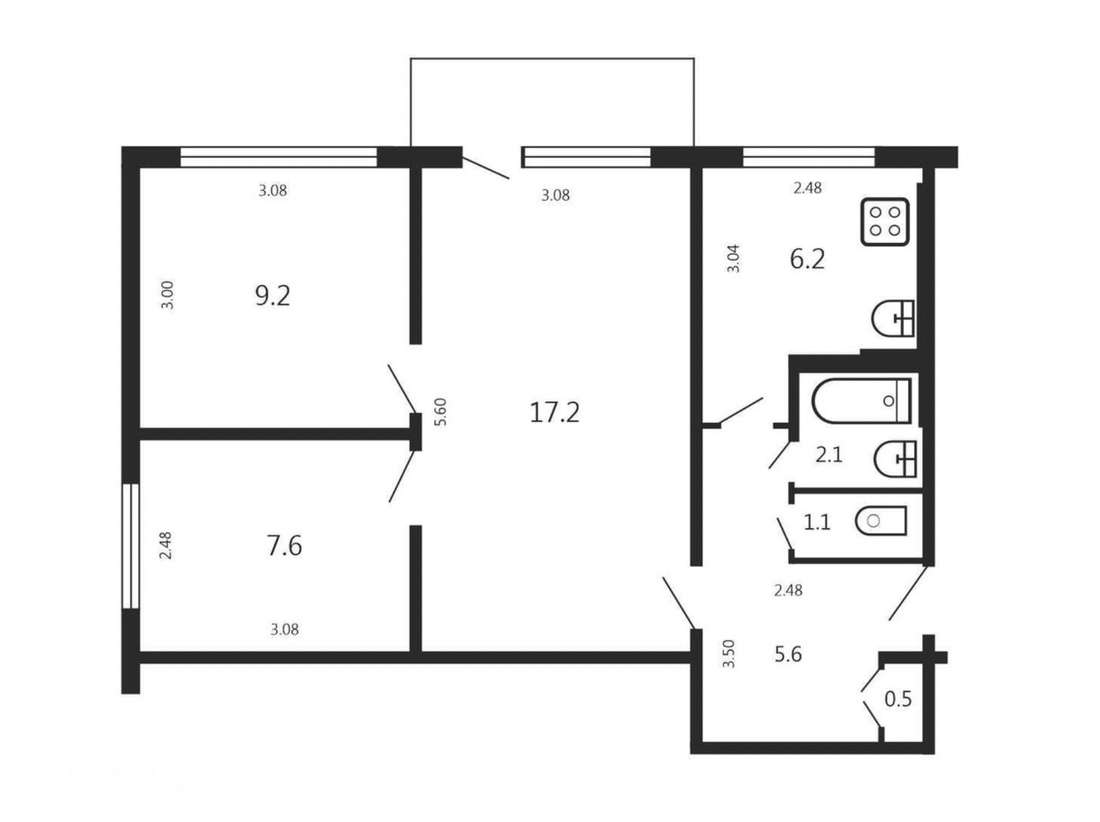 Наконец, подбираемся к трешкам. Первый вариант скрывается в панельке 1971 года на проспекте Рокоссовского. За нее просят 55 500 у. е. Размер — 49,5 кв. м. Ремонт явно не такой и древний, правда из мебели новым хозяевам достанутся только встроенные шкафы в прихожей и спальне. Так что готовьтесь к дополнительным тратам.