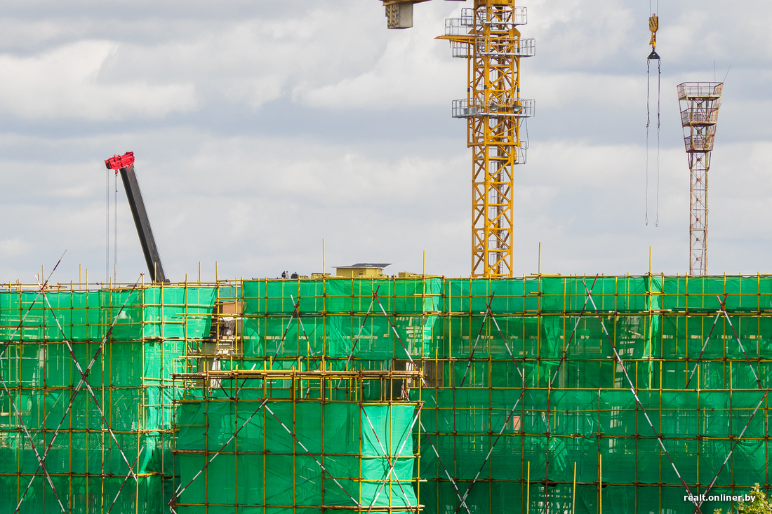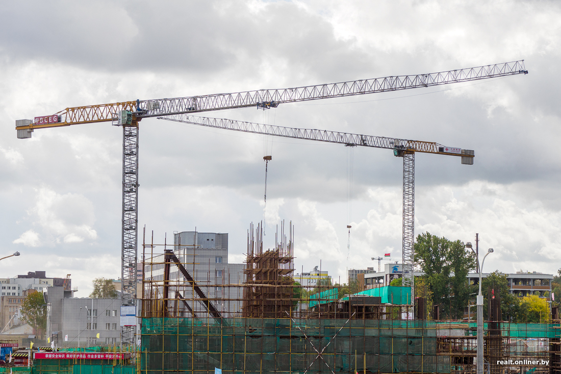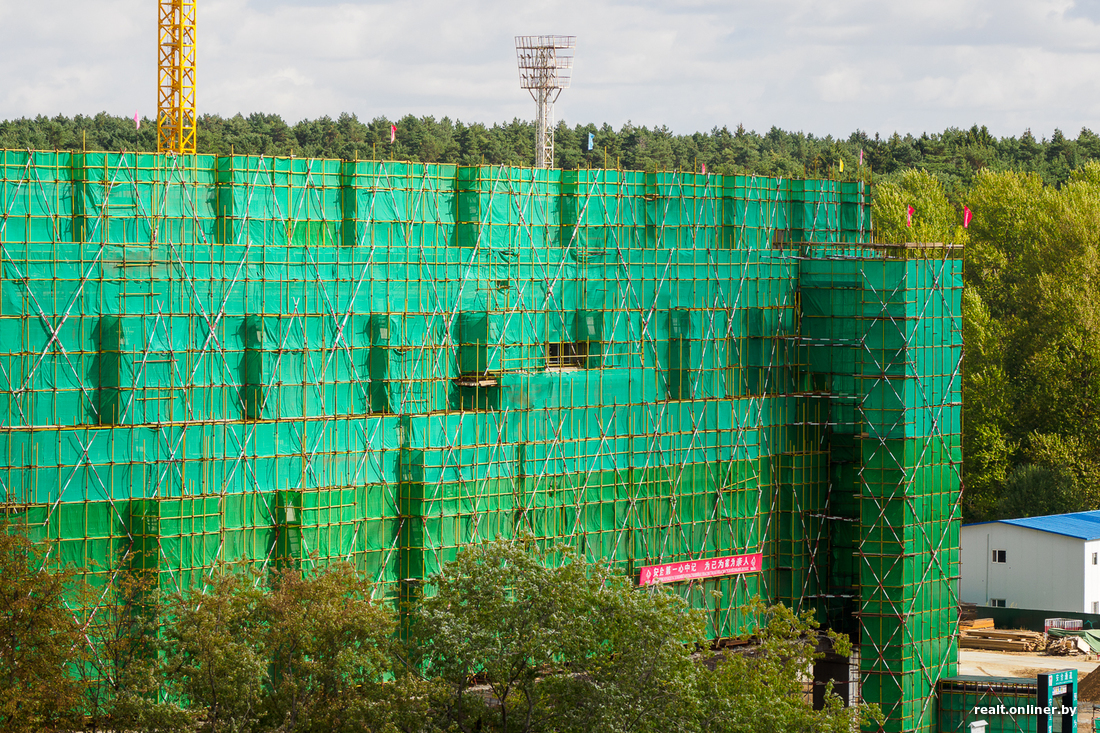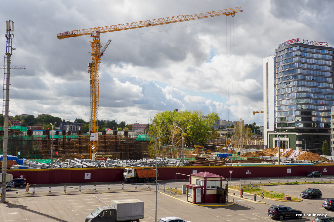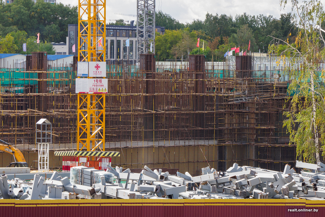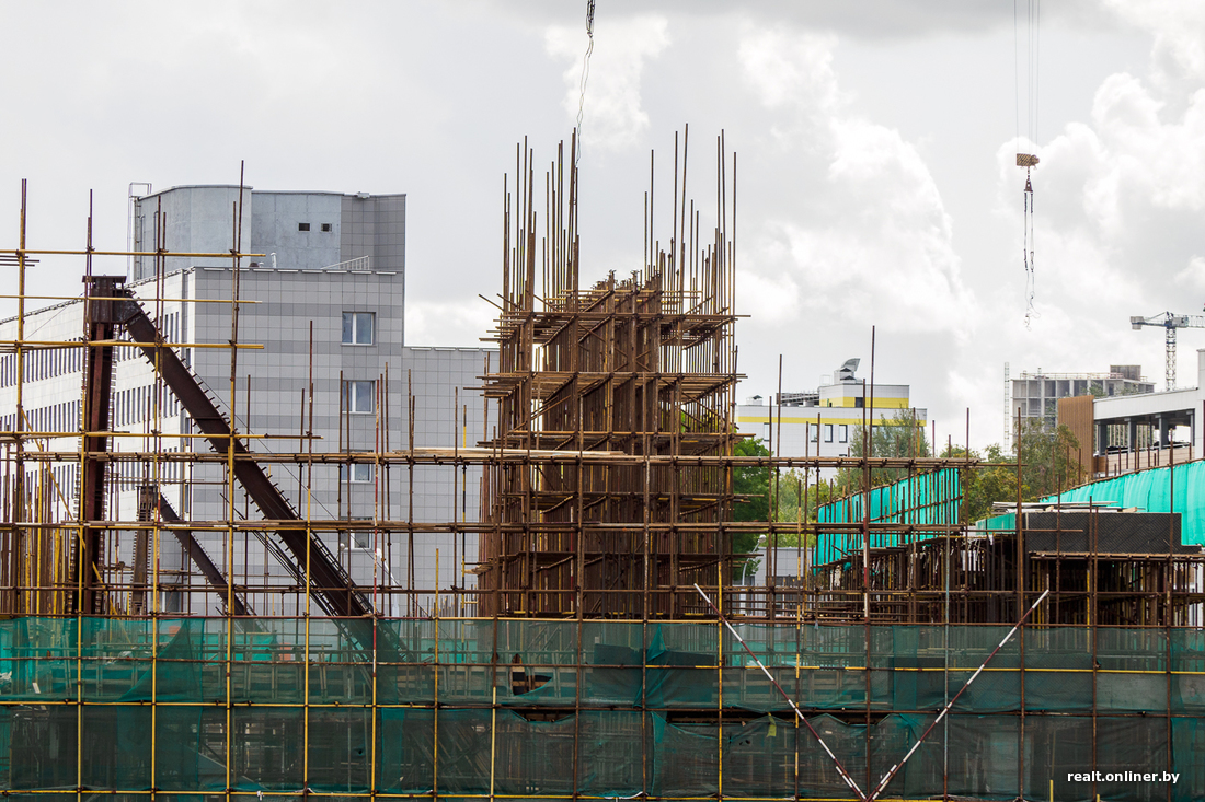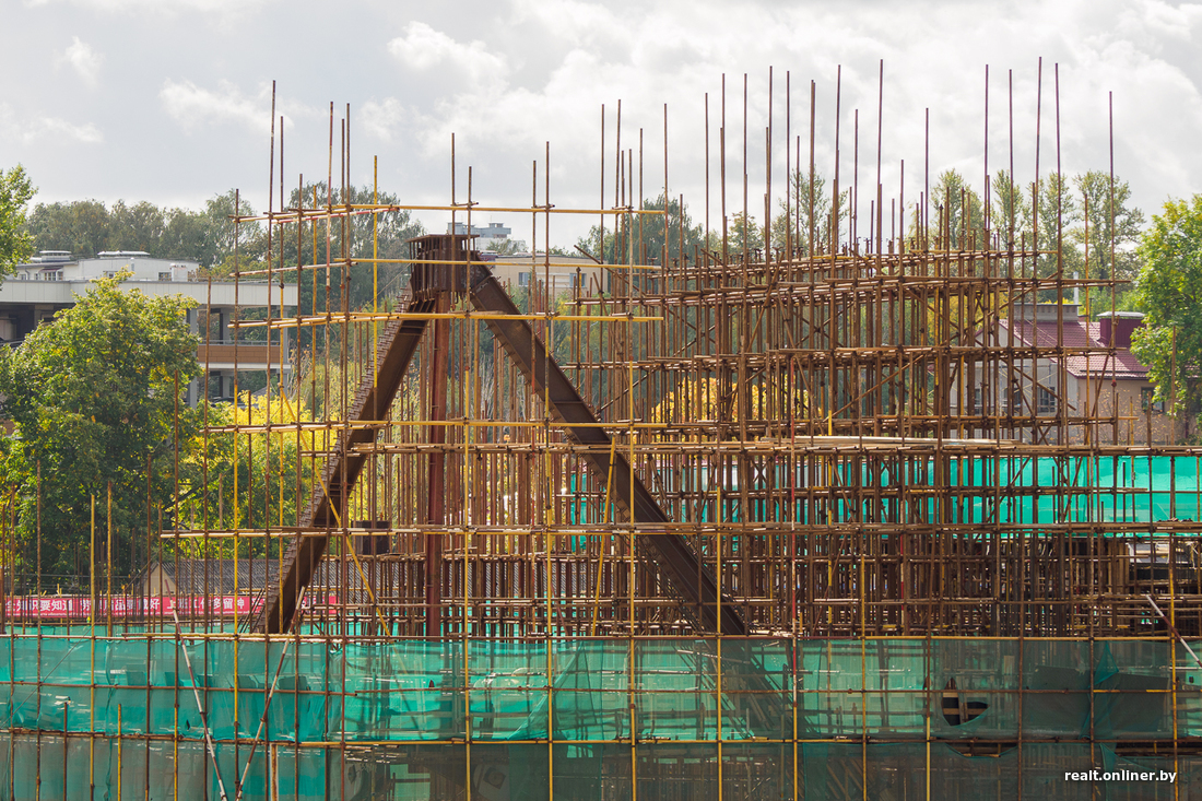 Выросло несколько этажей, из конструкций уже начали формировать ромбы, которых с фасадной стороны будет пять. Раньше рассказывали, что ромбы будут отсылать к элементам белорусского орнамента.