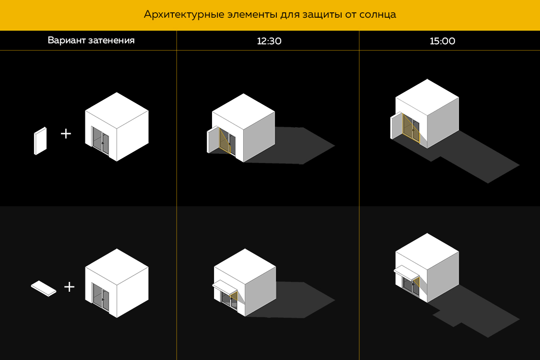 Варианты защиты от перегрева помещений могут быть самые разные. Одним из наиболее популярных приемов является создание затеняющего элемента. Этим элементом может быть стена, находящаяся недалеко от оконного проема; декоративный элемент; выступающая часть соседнего помещения.