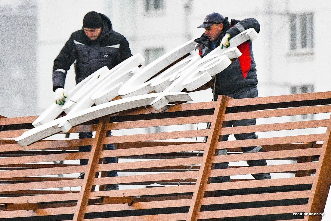Невзирая на погоду, рабочие «откручивают» одни из самых узнаваемых символов в мире. Скоро на их месте появятся кириллические буквы и новые цвета нового бренда.
