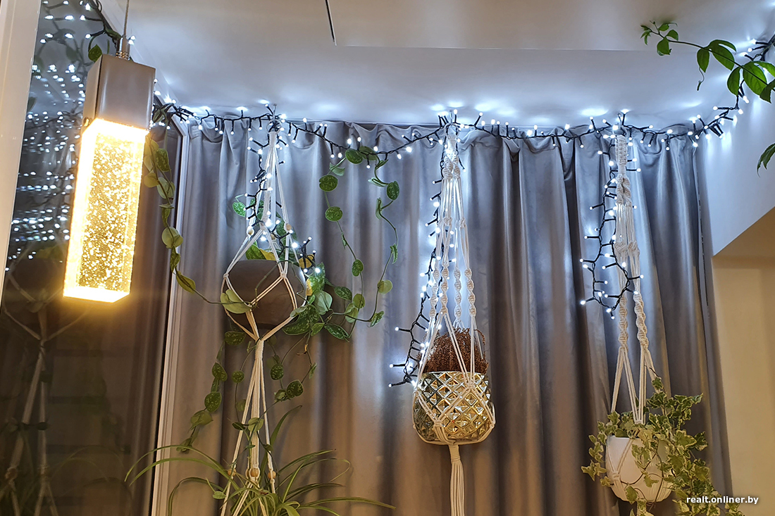 Стены я хотела покрыть моющейся краской, т. к. декоративная штукатурка не нравилась. Взяли в аренду краскопульт и покрыли все поверхности. Антресоль, скамейку проектировали и делали сами. Матрасы на скамью шили на заказ. Подвесное кресло тоже сделали на заказ, но там напутали с размерами и пришлось его продать. Долго искала подвесные кашпо, в итоге заказала макраме на AliExpress, т. к. никто не хотел браться за мелкий заказ.