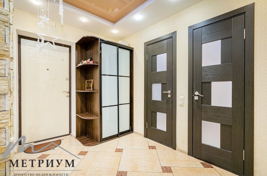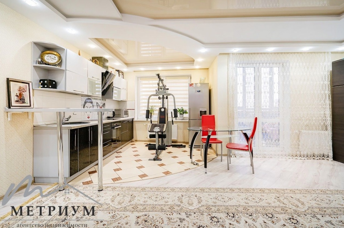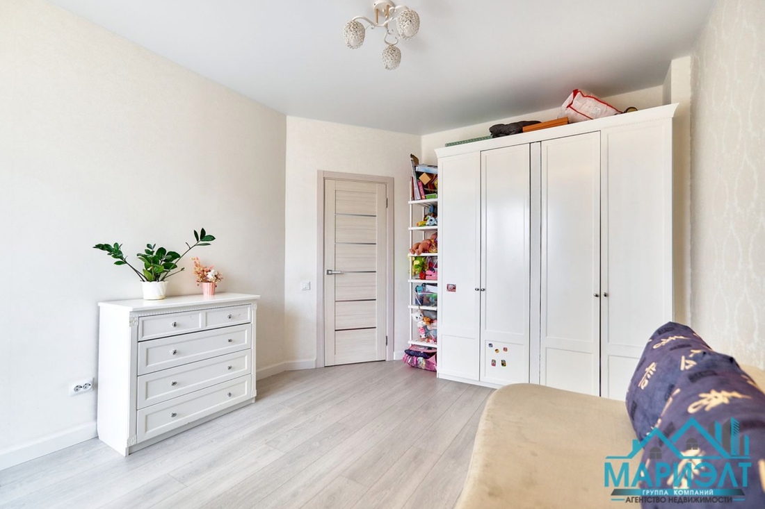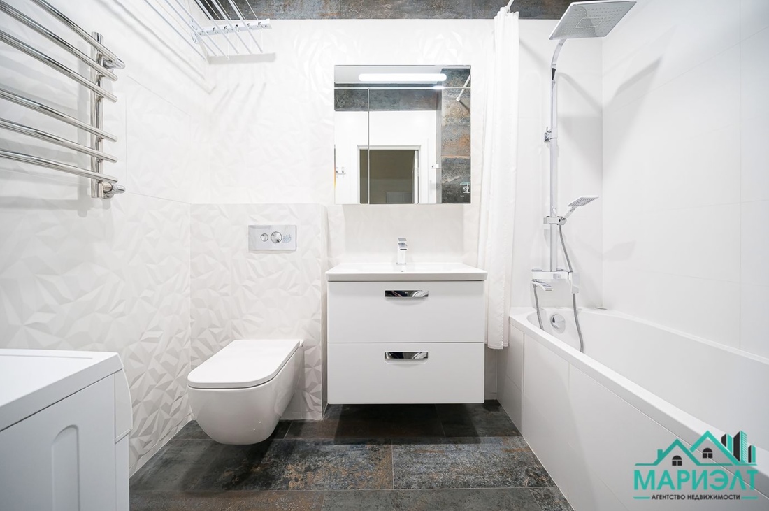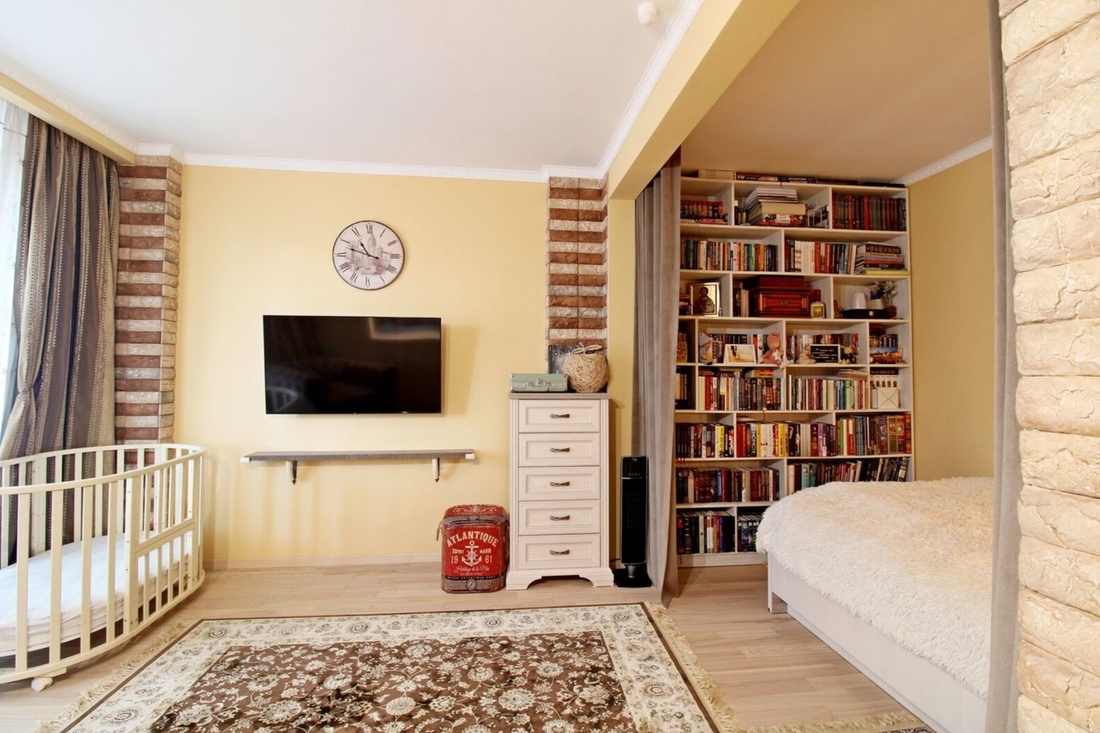 $133 000 в эквиваленте — цена евротрешки в десятиэтажке 2012 года. Площадь — 71,9 «квадрата». Подойдет для семьи с ребенком: одна из комнат переделана под детскую. Кухня совмещена с гостиной, в спальне есть рабочая зона и внушительная система хранения. А еще тут два санузла.
