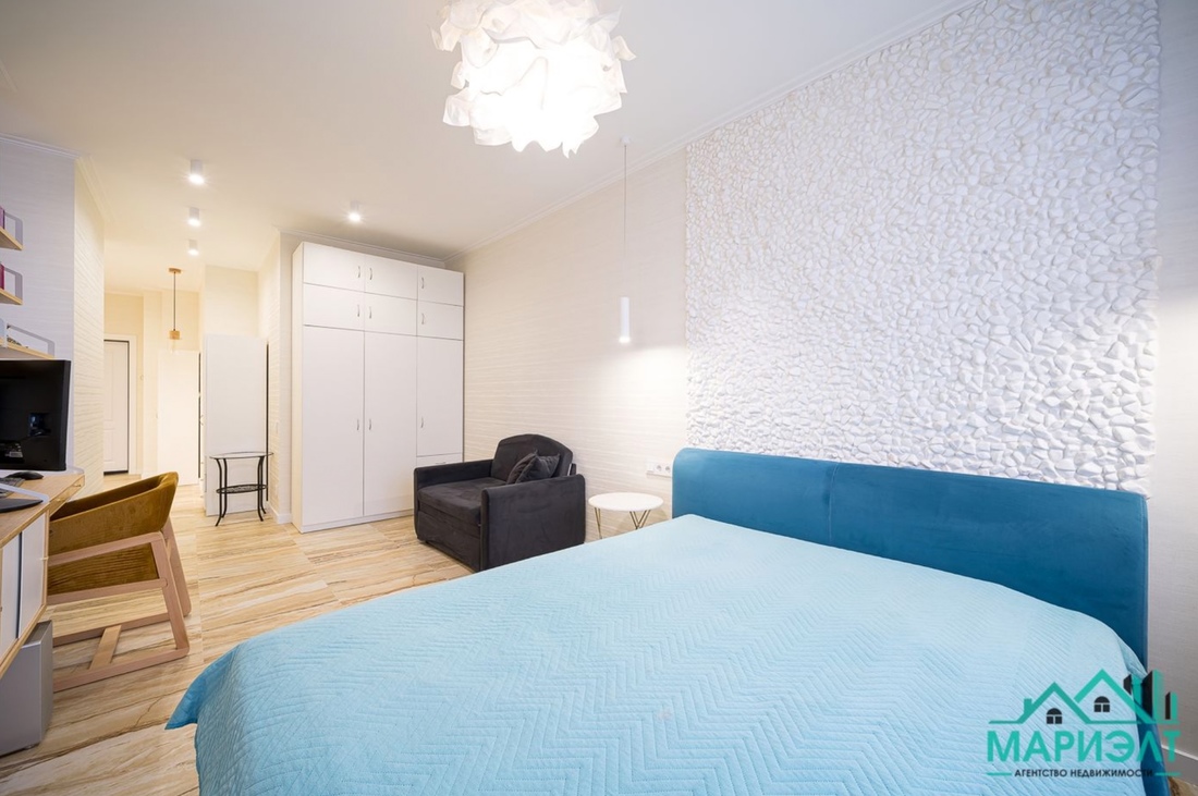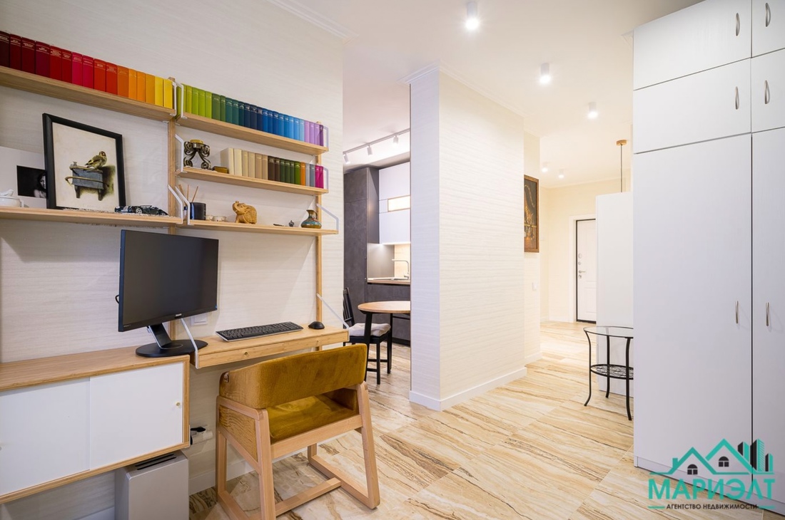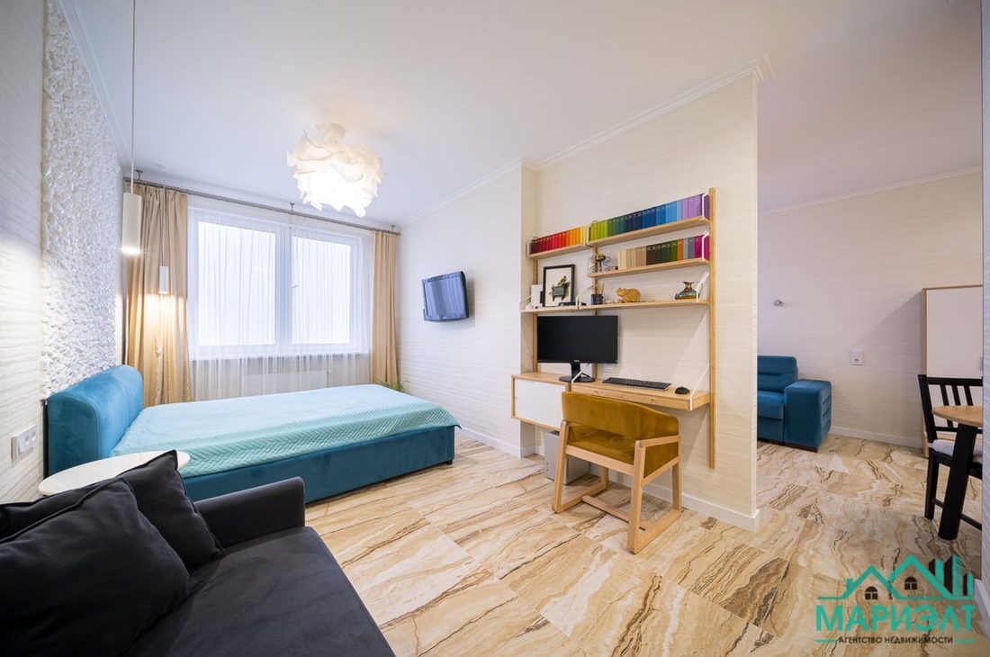 На $5000 дороже обойдется жилье в доме поновее: его построили в 2017 году. Размер — 41,7 «квадрата». Представляет собой студию, разделенную на несколько зон — кухню, гостиную и спальню. Лоджия переделана под рабочий кабинет.