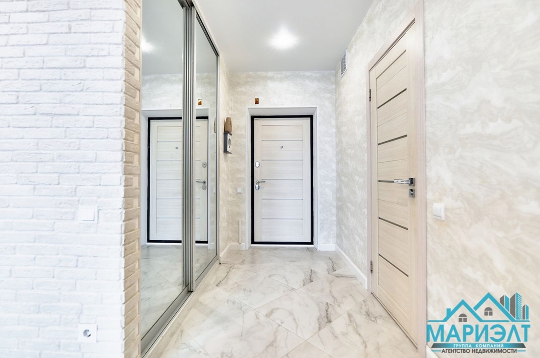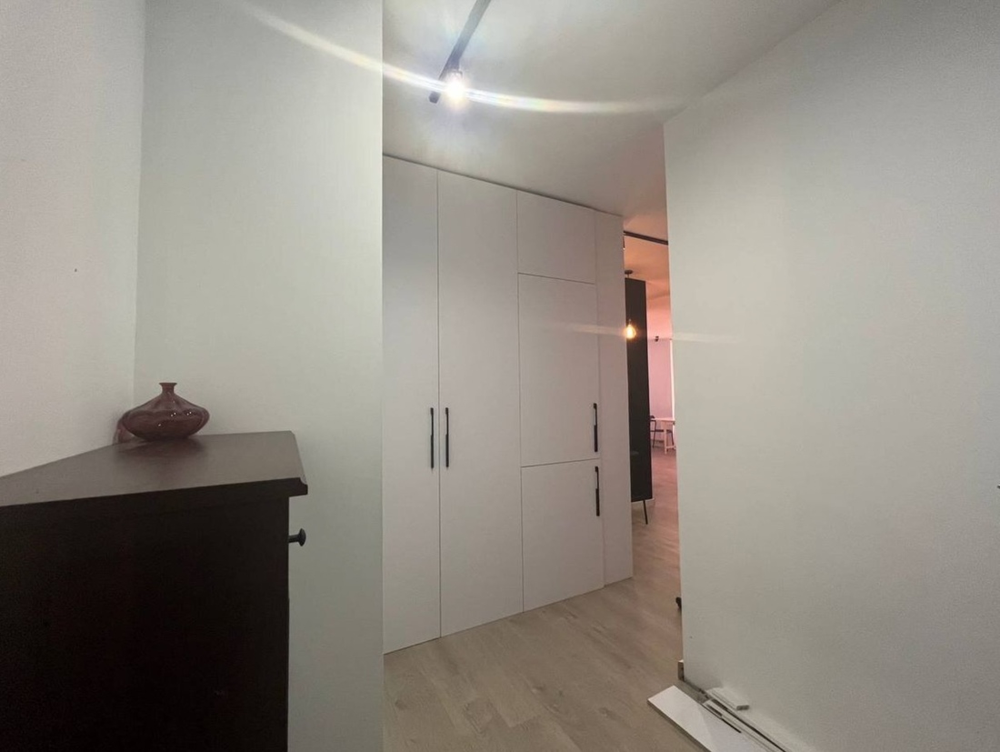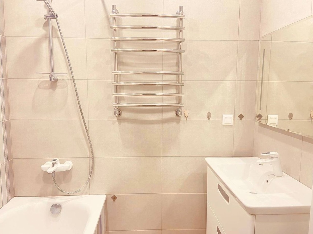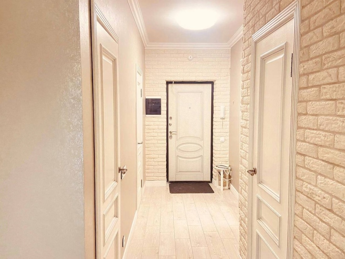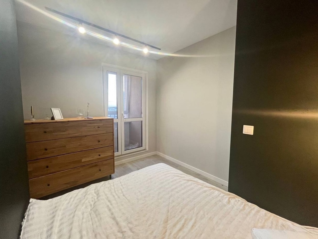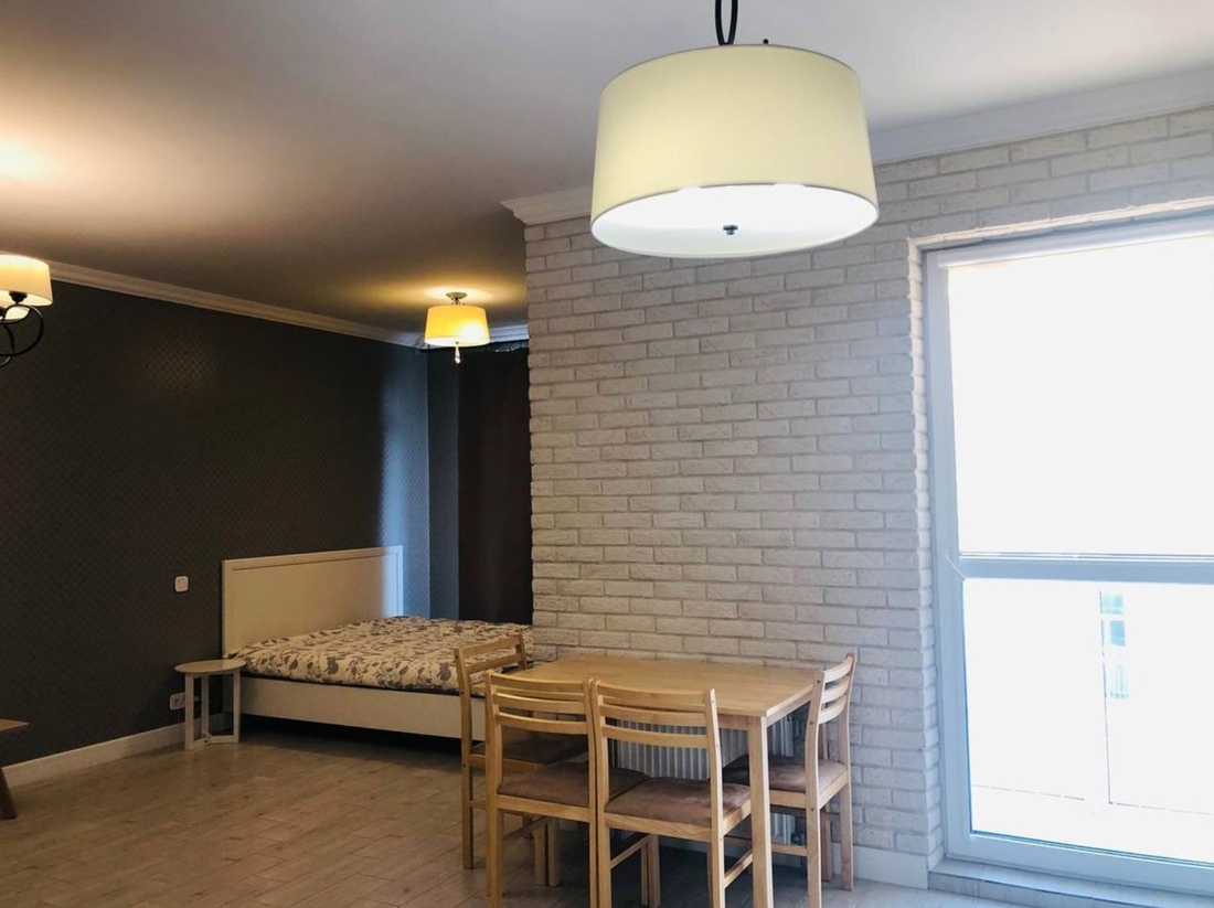 Столько же стоит однушка в высотке 2016 года. Площадь — 45,3 кв. м. Интерьер тяготеет к минимализму: преобладание белых и серых оттенков, стены под кирпич, использование дерева, не так много мебели. Хозяева уверяют, что квартира в идеальном состоянии, так как ремонт был сделан не сразу после покупки и проживали здесь всего несколько лет. Собственно, при просмотре сможете проверить.