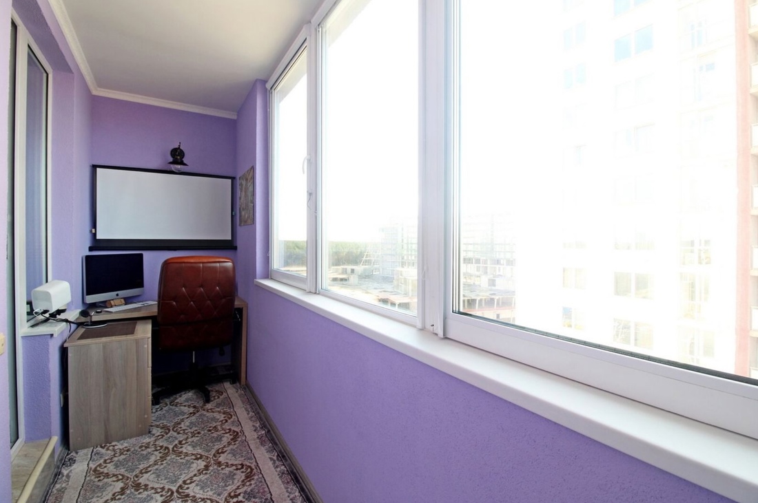 А за 95 000 у. е. можно взять студию на 17-м этаже каркасника 2017 года. Ее площадь — 45,6 «квадрата». На фотографиях смотрится довольно просторной. На лоджии также оборудована зона отдыха и рабочее место. Ремонт выполнен в пыльно-розовых тонах, что выгодно выделяет квартиру на фоне других объектов. Продается со всей мебелью и техникой.