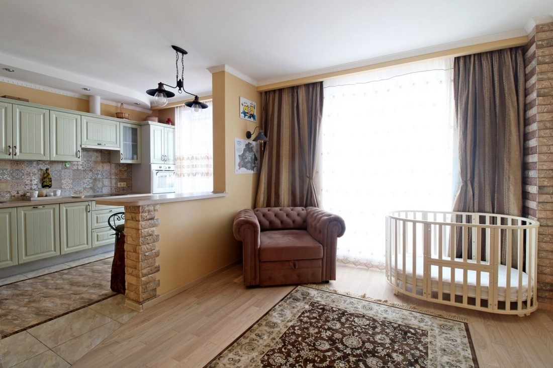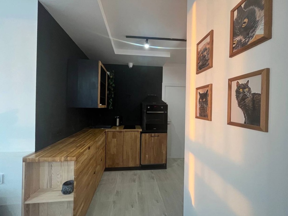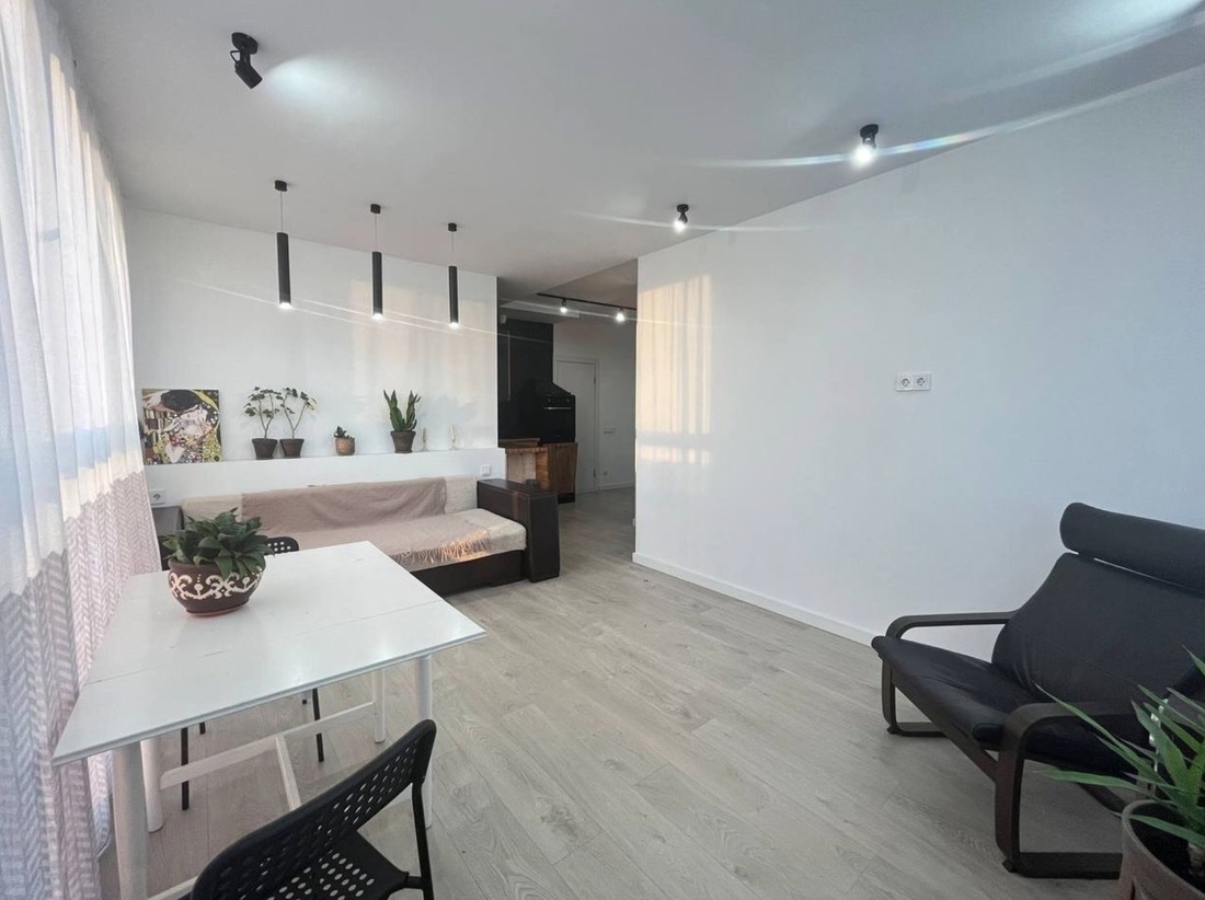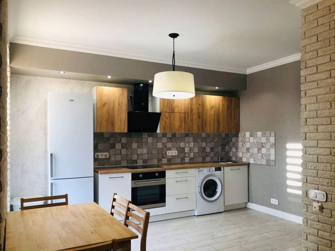 Не устали от подобного формата жилья? Тогда ловите очередную квартиру с совмещенной кухней и гостиной и отдельной спальней. Цена — 97 000 у. е. Скрывается в доме 2017 года. Размер — 44 кв. м. Тут все стандартно (в хорошем смысле): современная планировка и такой же ремонт, мебель на заказ, много мест хранения.