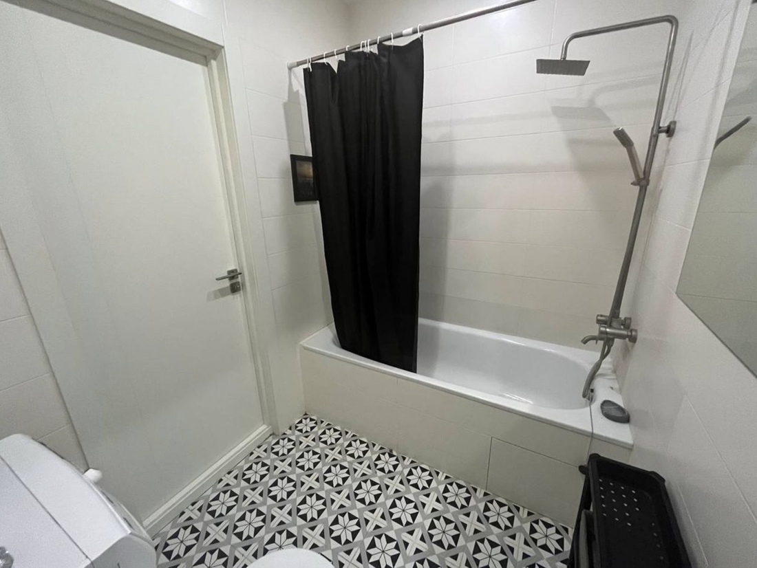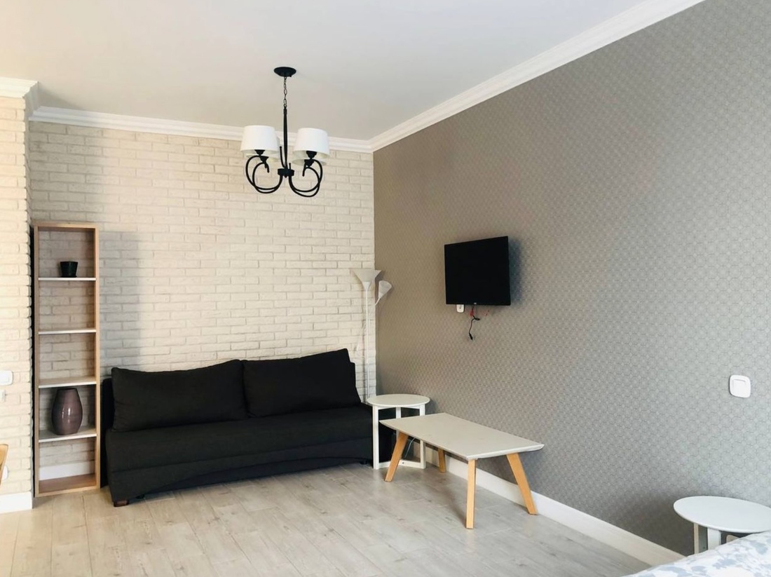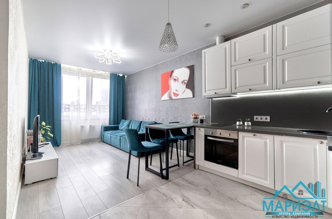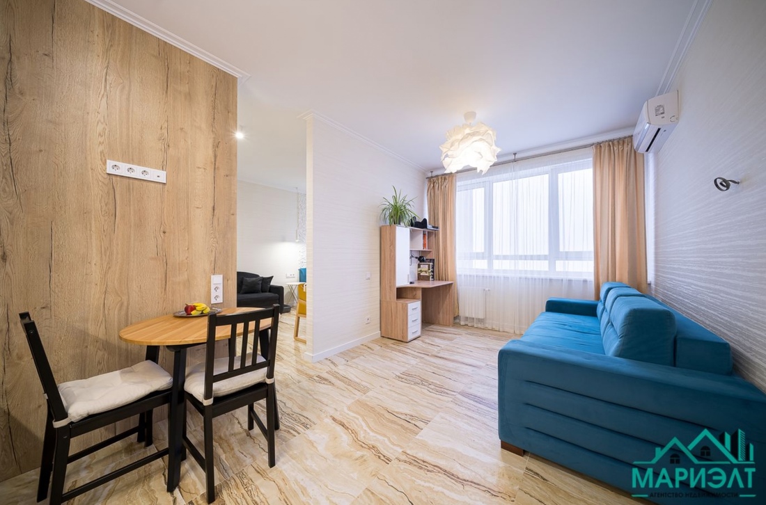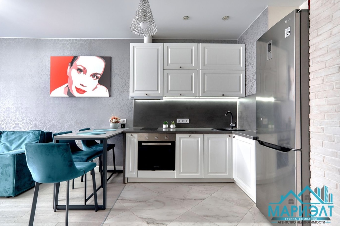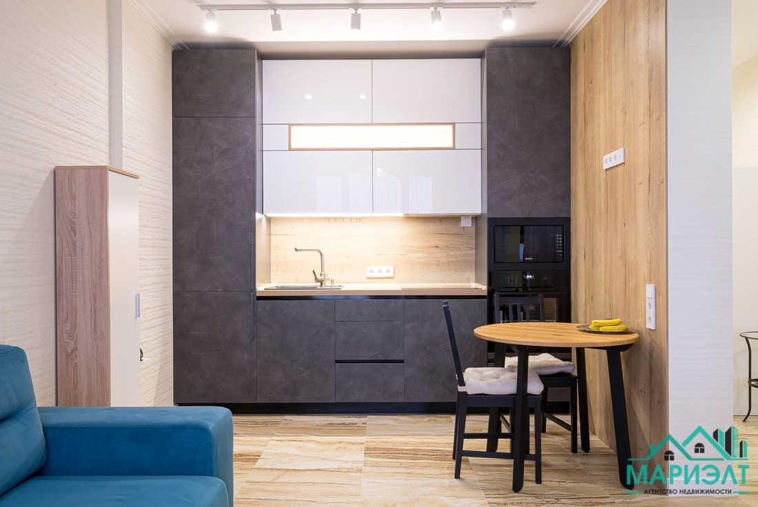 По традиции начинаем с однушек. Самой дешевой можно считать квартиру за $85 000 по курсу, скрывающуюся в десятиэтажке 2011 года. Площадь жилья — 37,4 кв. м. Состоит из отдельной кухни, жилой комнаты и совмещенного санузла. В целом выглядит достаточно современно и свежо. Хозяева обещают оставить после себя довольно много из обстановки: кухонный гарнитур со всей встроенной техникой, корпусную мебель, два дивана, ванную, биде и декоративные зеркала.