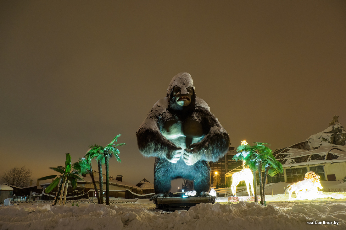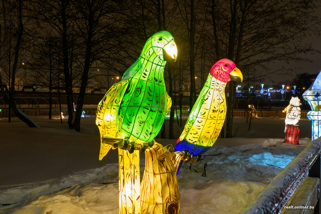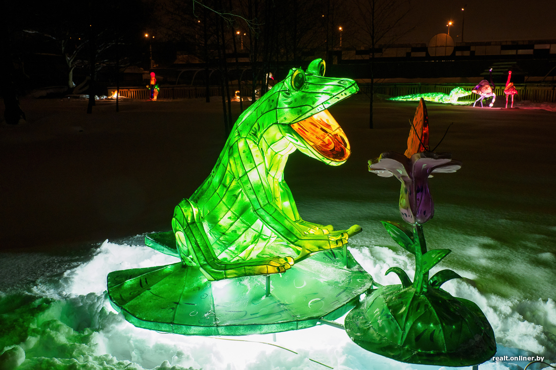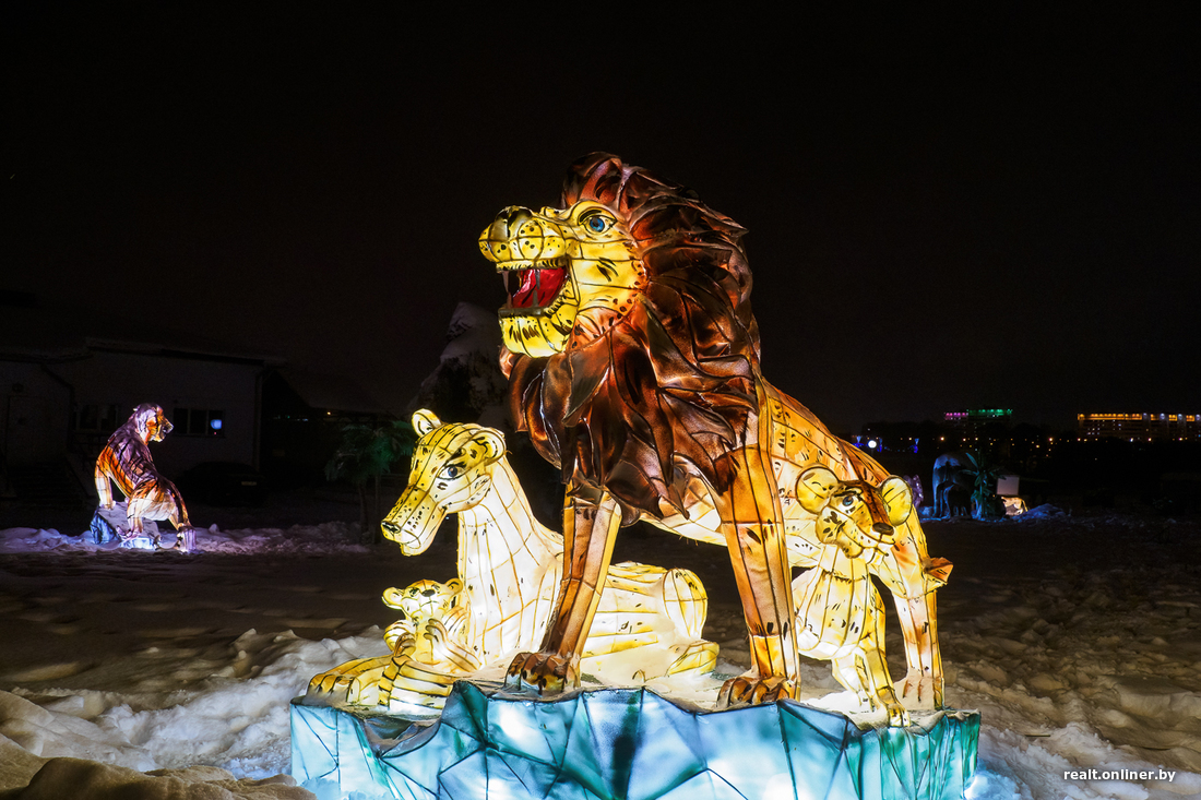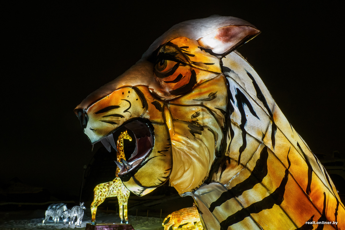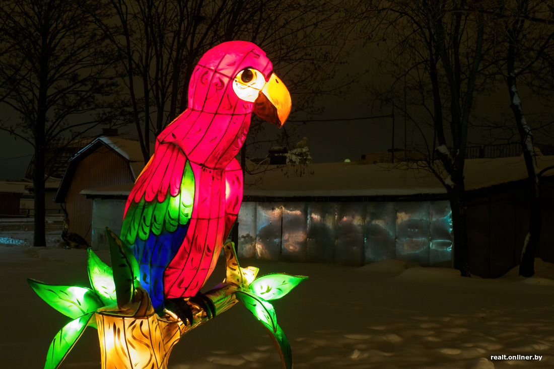 Что-то похожее в Минске уже было в марте прошлого года, но тогда фестиваль фонарей проводили в Ботаническом саду. Там были ведьмы, тролли, огромные змеи и пень. В зоопарке же без сказок — здесь все настоящие.
