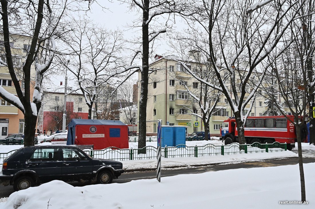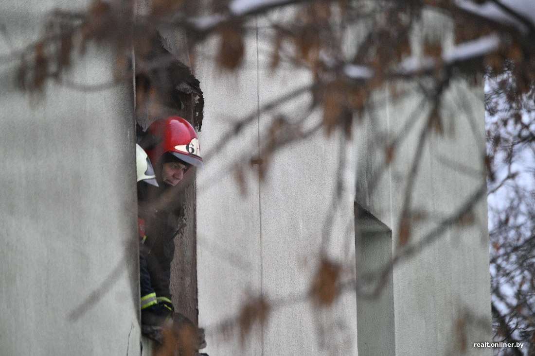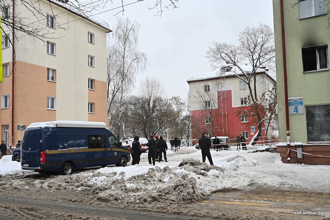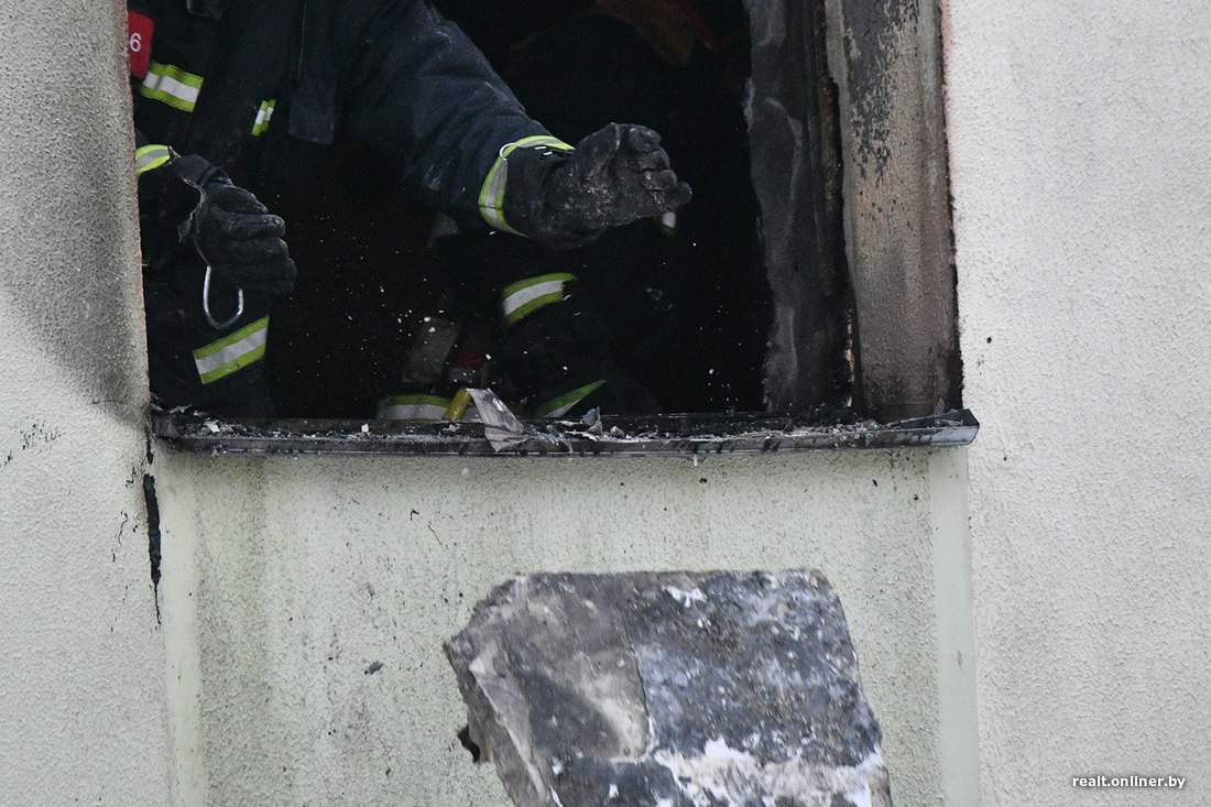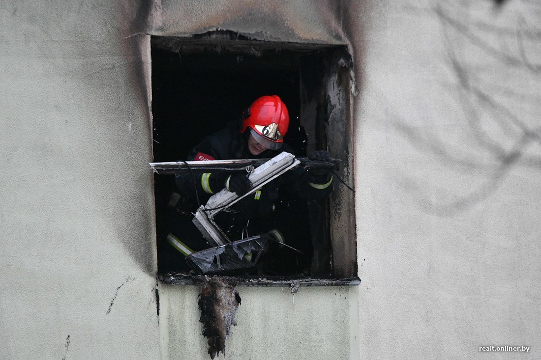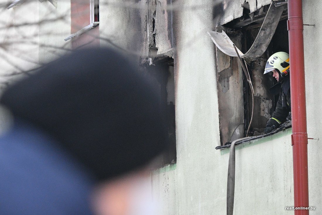 Корреспондент Onlíner передает с места происшествия, что территория возле здания оцеплена, туда никого не пускают. На втором этаже продолжают работать пожарные. Там квартира повреждена сильнее всего, выбиты окна. Впрочем, следы пожара видны и на третьем, и на четвертом, и на пятом этажах.