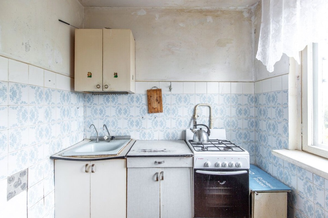 Владелец честно признается: его собственности требуется серьезное обновление. На это намекают и обшарпанный пол, и старенькие обои. Зато вид из окон хороший, зимой тепло — по крайней мере, так сказано в объявлении.