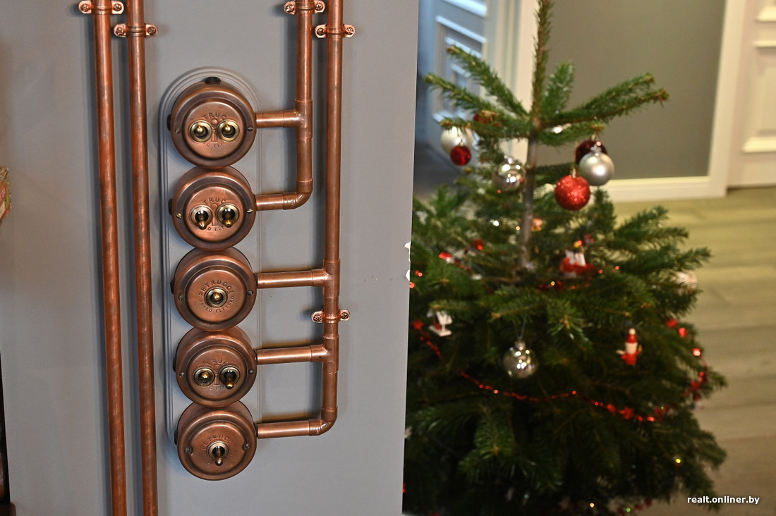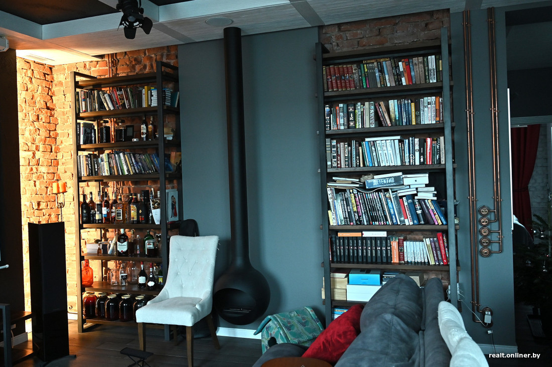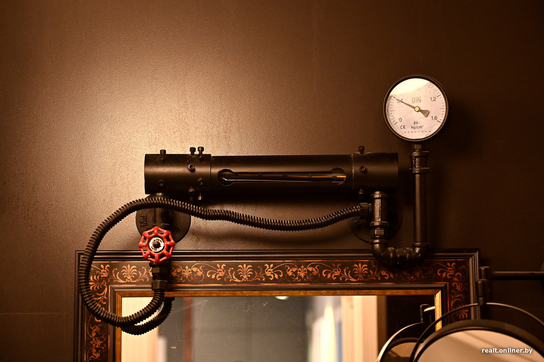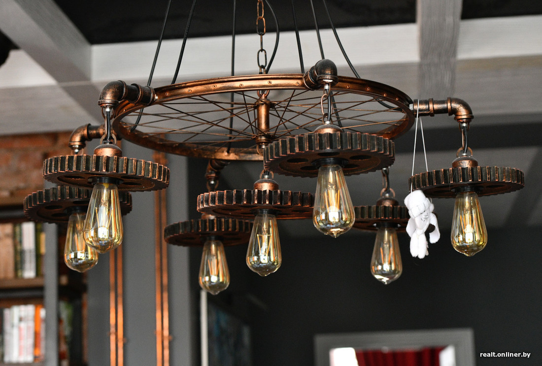Сталинку площадью 100 «квадратов» на улице Карла Маркса Тимур с женой купили восемь лет назад. Первое время жили, сделав легкую «косметику», а уже потом принялись обустраивать жилище на свой вкус. Паре хотелось, чтобы внутри было много открытого кирпича, преобладала черно-бело-красная цветовая гамма с налетом стимпанка. Стиль в мелочах: вот трубки, где прячется проводка, плита, вытяжка из меди и бронзы. Супруги также мечтали разместить в помещении домашний кинотеатр, уложив, чтобы не мешать соседям, серьезную звукоизоляцию. И наконец, было желание создать умный дом.