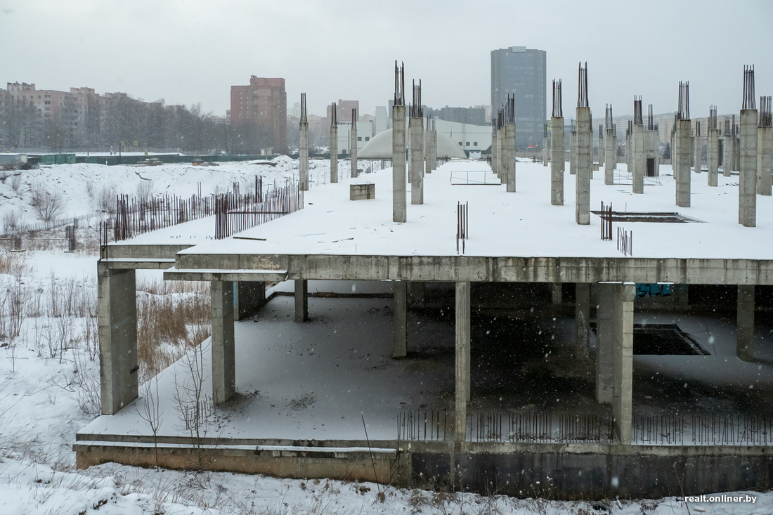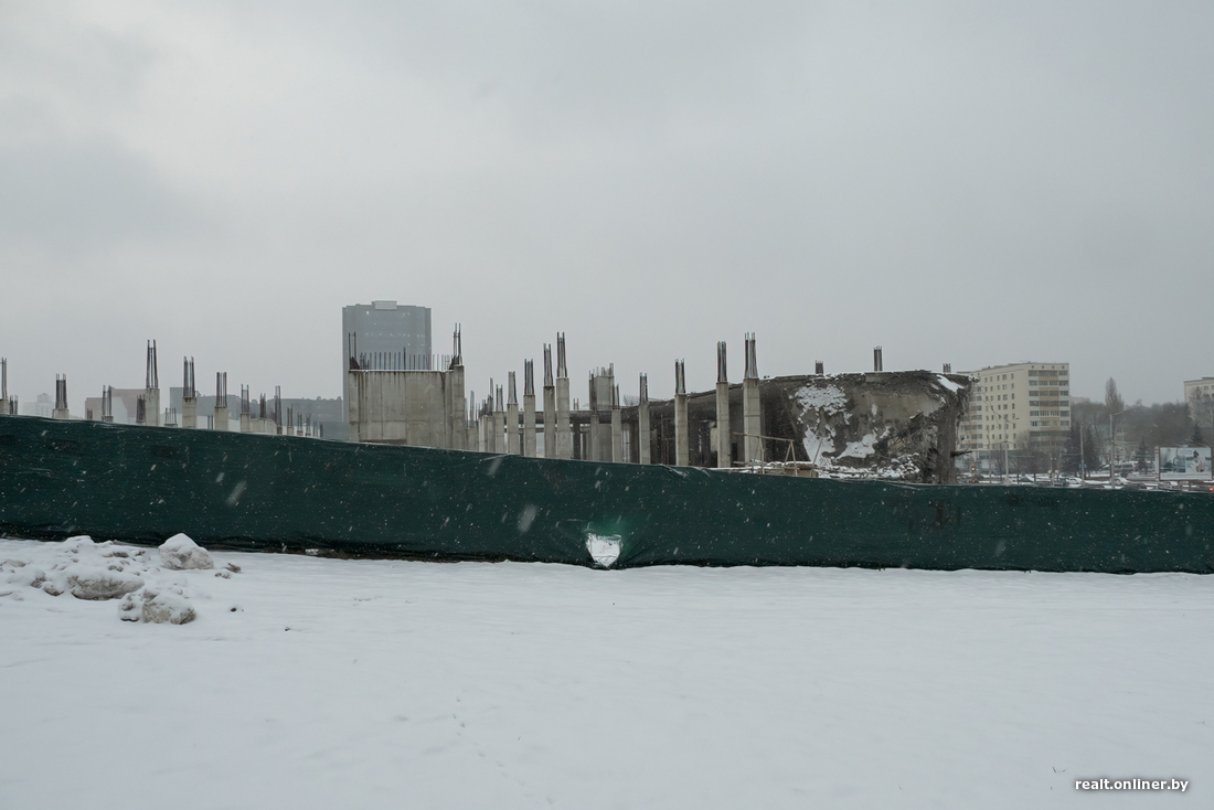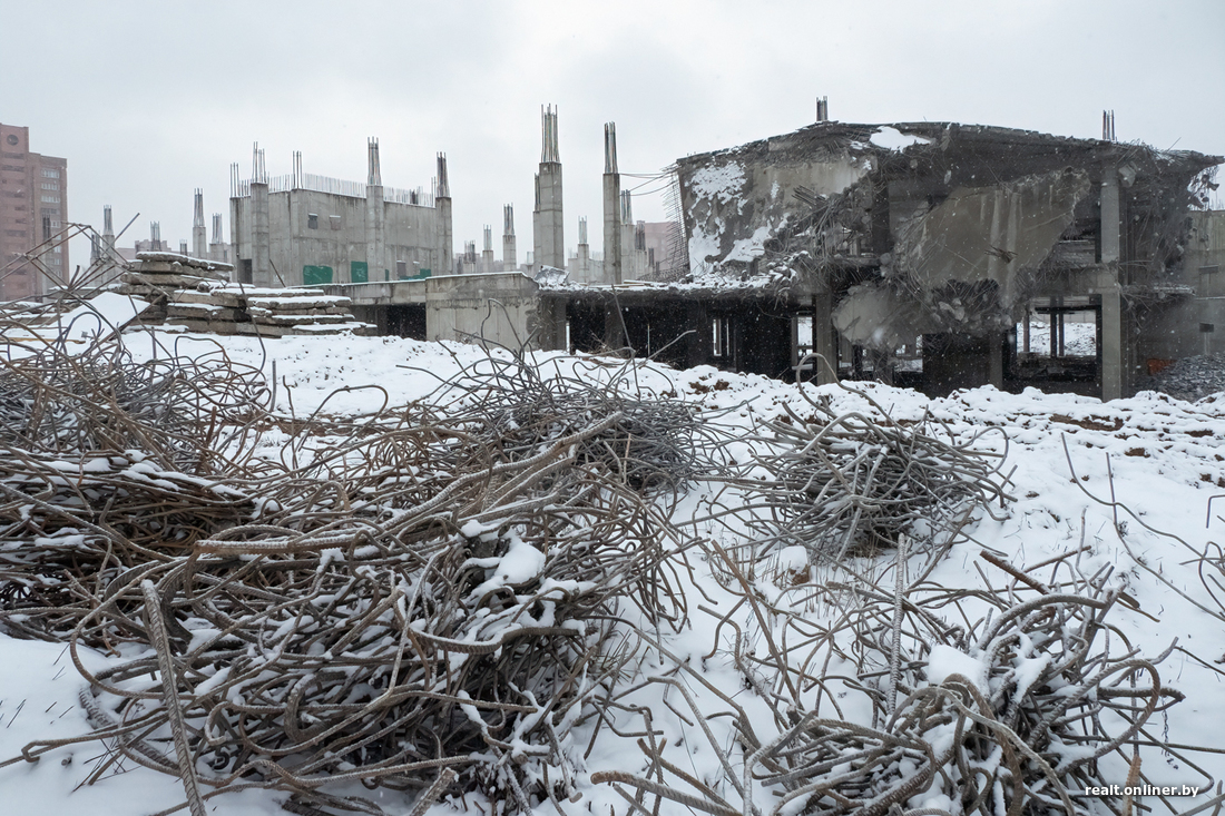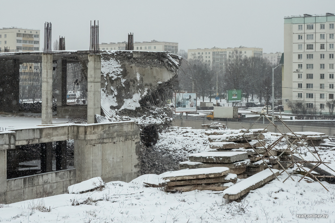 В прошлый четверг случилось то, во что уже никто не верил. Один из самых жалких долгостроев Минска, простоявший под открытым небом без малого десять лет, начали сносить. Объект, который должен был превратиться в огромный торгово-развлекательный центр и удивлять нас изобилием еще в 2015 году, в итоге достиг лишь 7 процентов готовности. Да так и остался стоять, щерясь в небо железобетонными колоннами. Раздражение горожан, слезы инвесторов (некоторые из них вложили в стройку по $500 000), неудавшиеся аукционы — чего только не было за эти долгие годы.