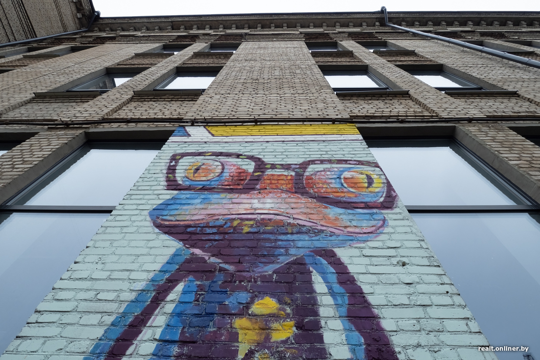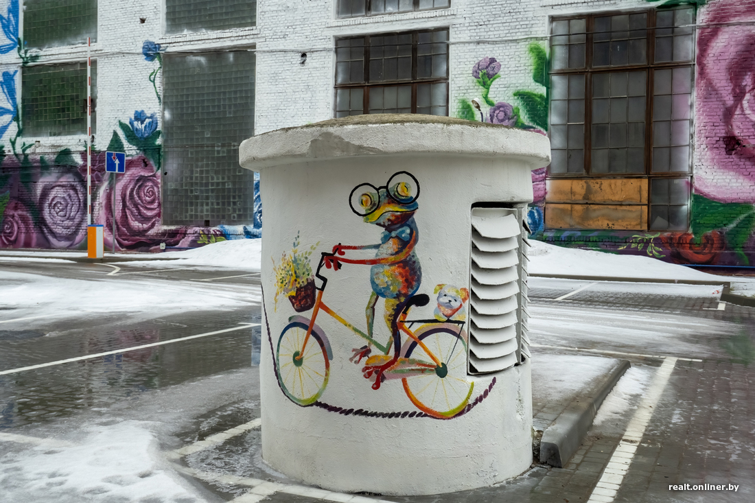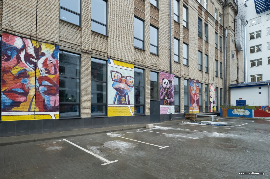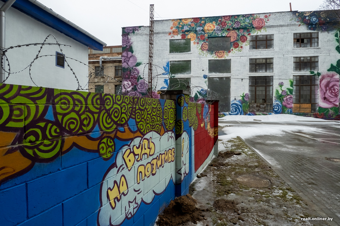 Внутренний двор D16 украсили граффити. Самая большая композиция — на еще действующем здании Минского завода автоматических линий. Есть рисунки и на задней стене бизнес-центра, и на верхушке бомбоубежища, которое выглядывает из-под земли.