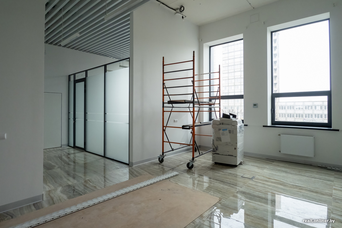 В некоторых помещениях на первом этаже арендодатель сделал второй уровень — благо шестиметровые потолки позволяют. Кое-где подиум с лестницей возводят сами арендаторы — как в салоне красоты, который на днях открылся в бизнес-центре.