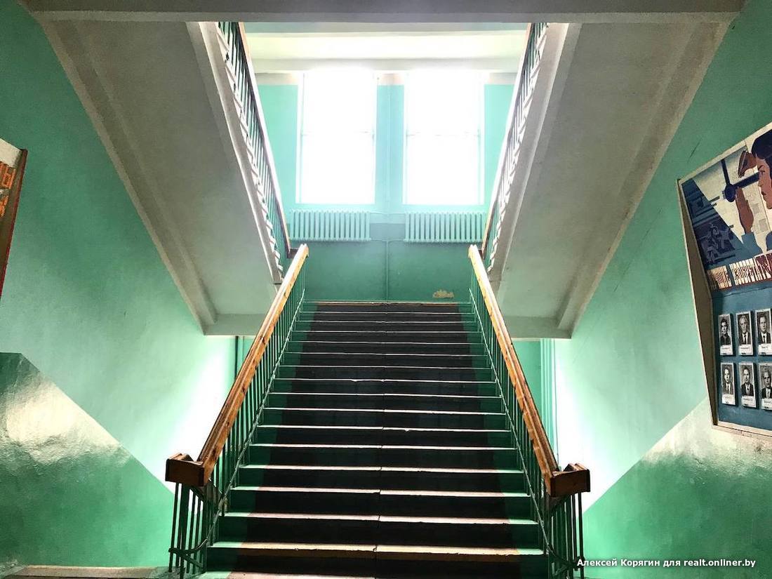 За центральным входом — холл и парадная лестница, оставшаяся в наследство от завода. Ее починили, покрасили, деревянные перила подшлифовали.