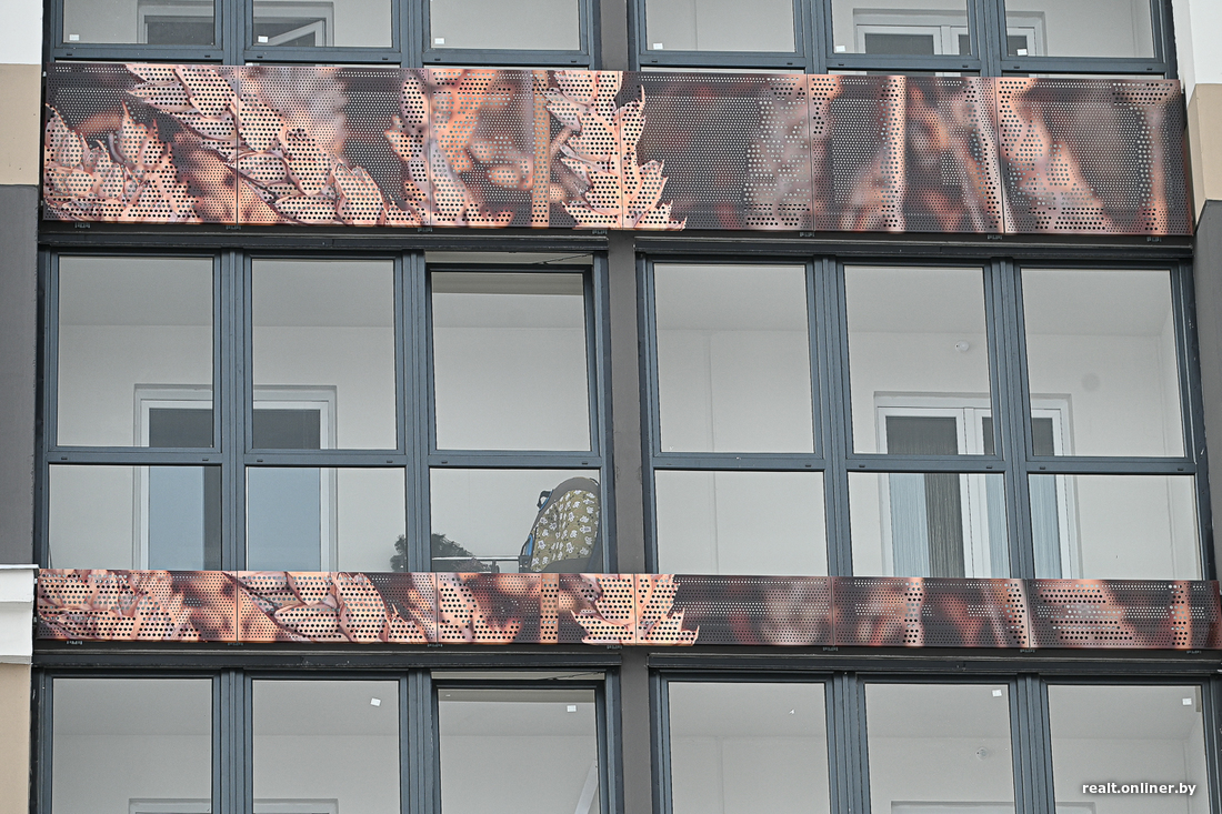 Силуэты листьев, а также цветов и колосков встречаются в том числе на торцах дома, где нет окон: ни одна вертикальная поверхность в ЖК не пропала. Чем еще оказались хороши «свечки», так это пристроенными к ним велоблоксами: весной и летом — незаменимая вещь.