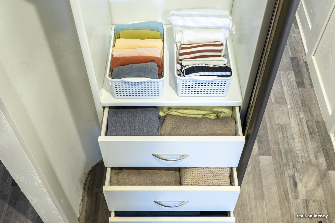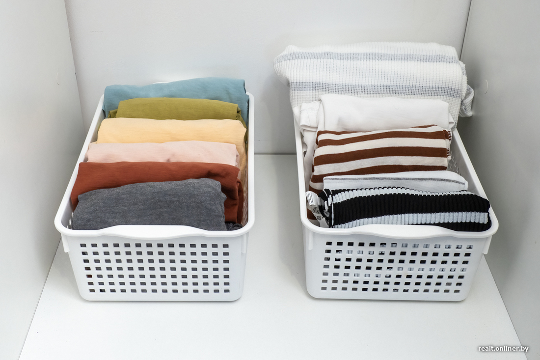 И еще про хранение одежды. Консультант по уборке считает, что складывать или развешивать (от вешалок она не отговаривает) вещи лучше по принципу от тяжелого/темного/длинного к легкому и светлому. При этом «дружить» между собой должны вещи одного вида: платья храните с платьями, джинсы — с джинсами. Так вы не будете тратить время на поиск, условно говоря, любимого галстука.