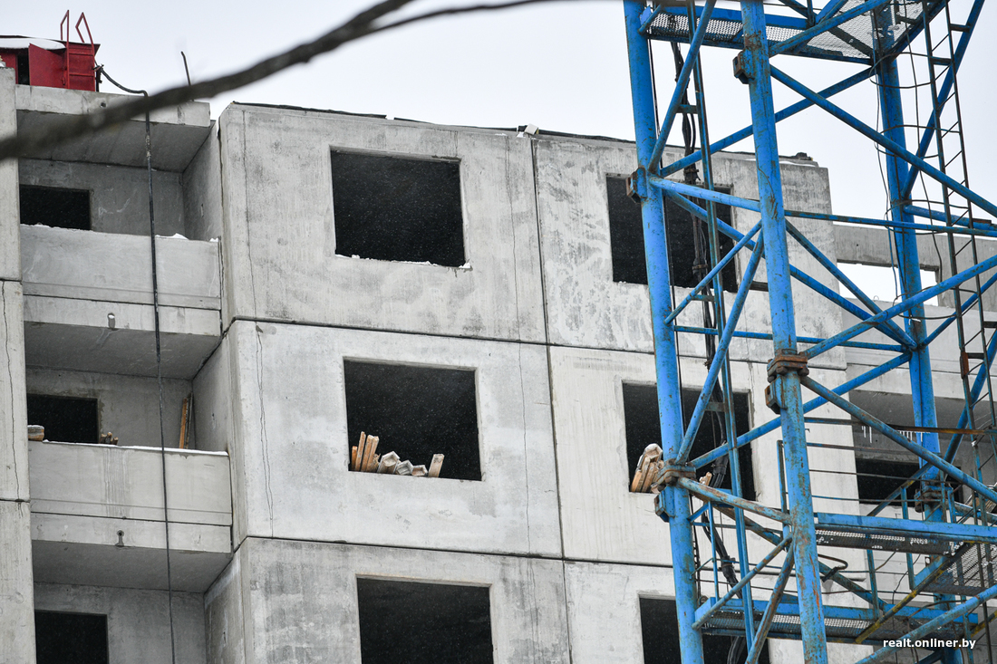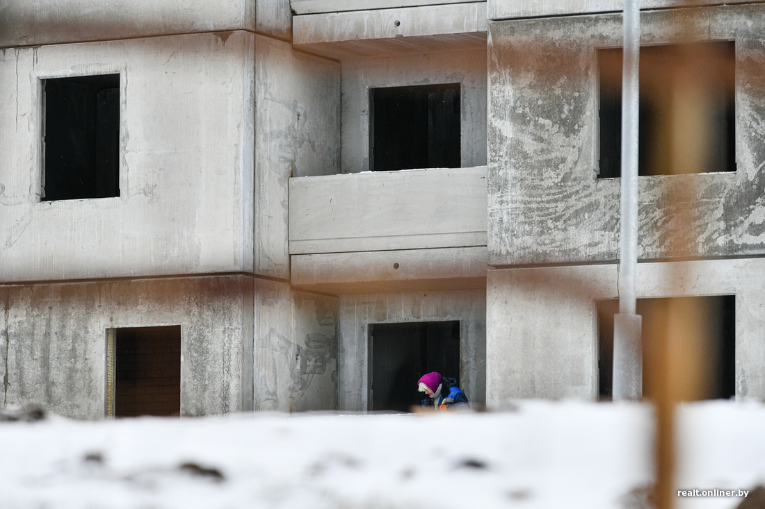 Самое большое здание на площадке — «стена» на четыре подъезда, №4 по генплану. Панелька серии М 464-М уже возведена, большинство оконных проемов остеклены, окна зияют чернотой только в нескольких рядах. Как рассказали Onlíner в УКСе Заводского района, строительная готовность этого дома — 75%. По плану его должны ввести в эксплуатацию этой осенью.