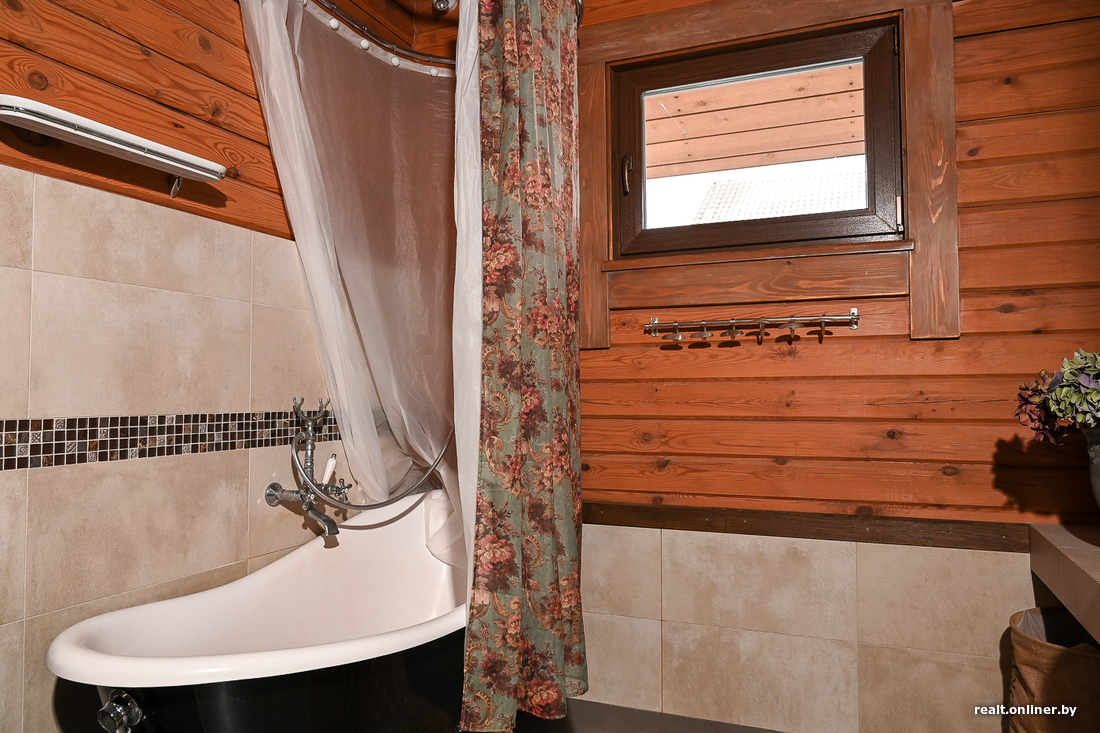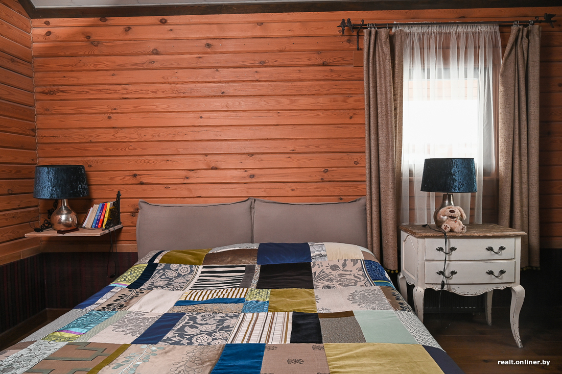 На коттедж ушло около 40 кубов древесины. Толщина стен составляет 22 см. Снаружи они покрашены, а внутри пропитаны специальным маслом.