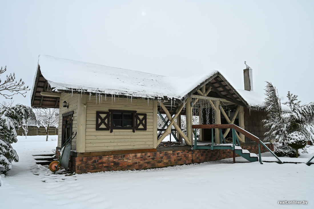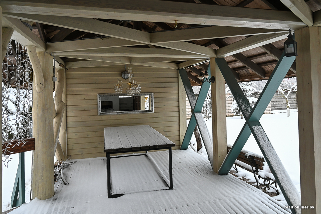 Помимо основного здания, на 18 сотках расположилась также беседка с летней кухней. Бревна, из которых ее соорудили, обрабатывались вручную. Еще тут нашлось место небольшому фонтану, дровнице, хозпостройке и экопарковке. Во дворе растет много разных деревьев — в теплое время года за ними ухаживает садовник.