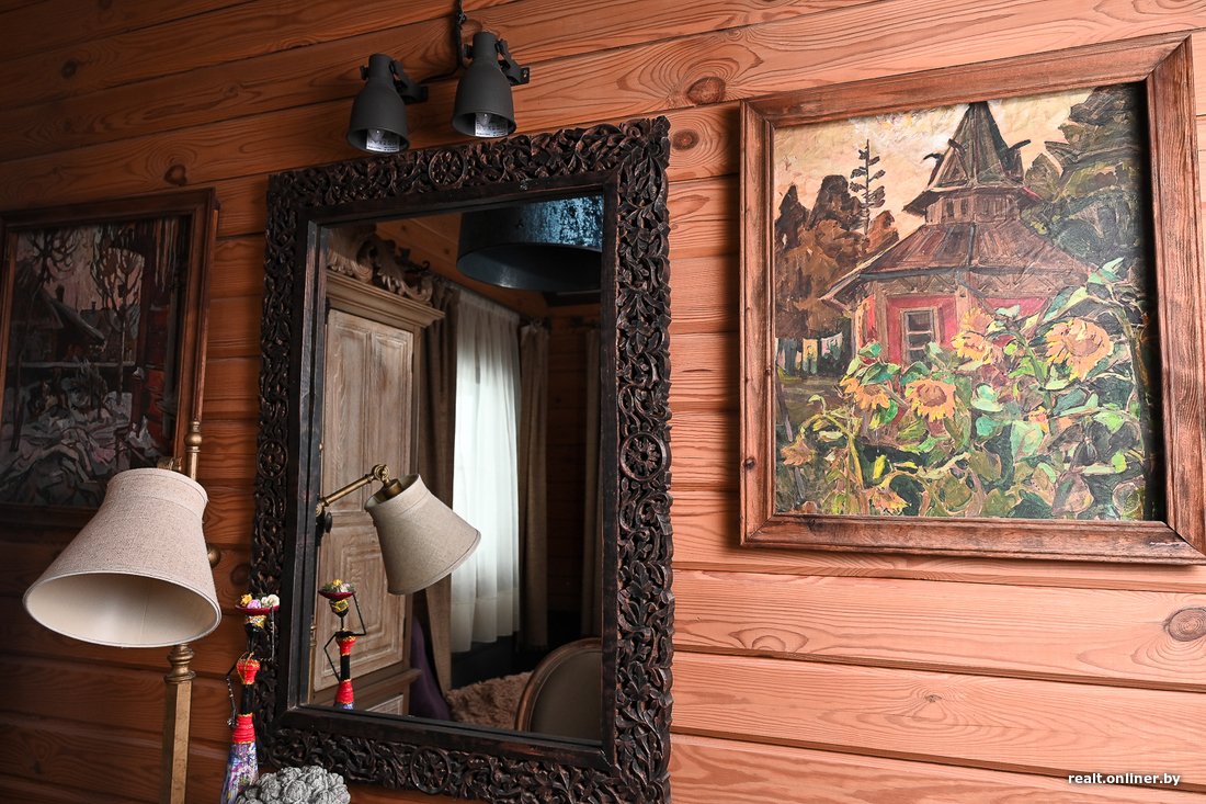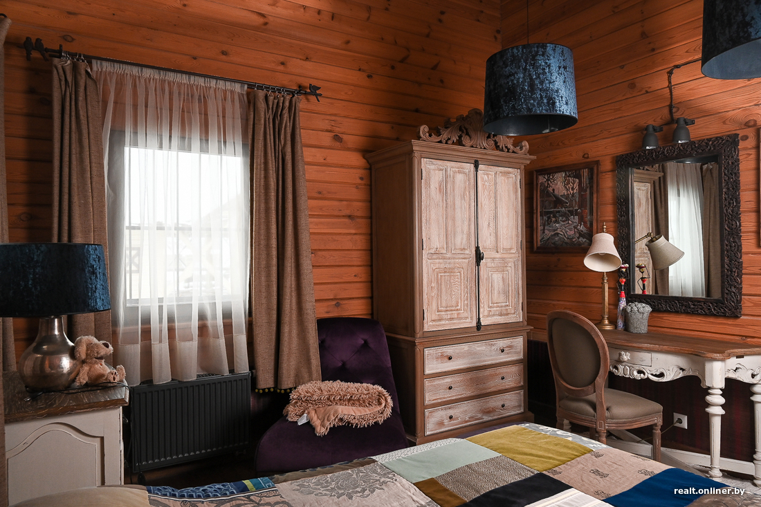 А вот вся мебель в комнатах, напротив, отнюдь не винтажная, хоть внешне ее и напоминает. Бóльшая часть выполнена из массива, заказывалась также из разных стран — Италии, Латвии, Германии. Что-то куплено в Беларуси.