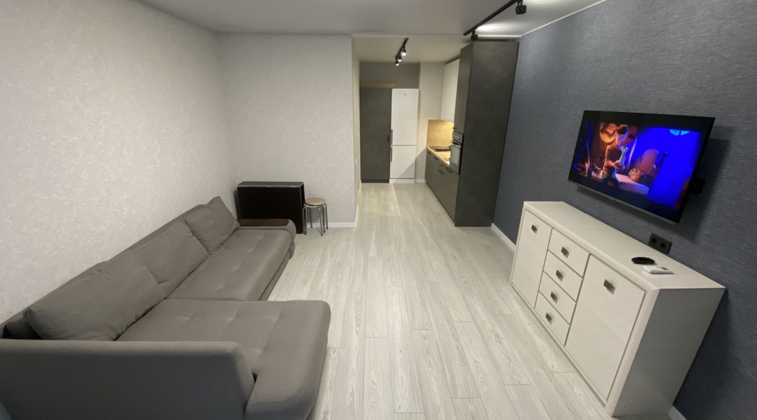 Стартует наш обзор с однушек (собственно, как и всегда). За 65 000 у. е. можно обзавестись студией, расположенной в высотке прямо рядом с проспектом Независимости. Правда, судя по фотографиям, окна выходят все-таки не на центральную городскую магистраль (тем лучше для любителей тишины). Размер жилья — 34,4 кв. м. Пока обустроены только кухня и гостиная. Небольшой кусочек комнаты пока свободен и ждет следующих хозяев, которые могут сделать там спальный уголок или кабинет.
