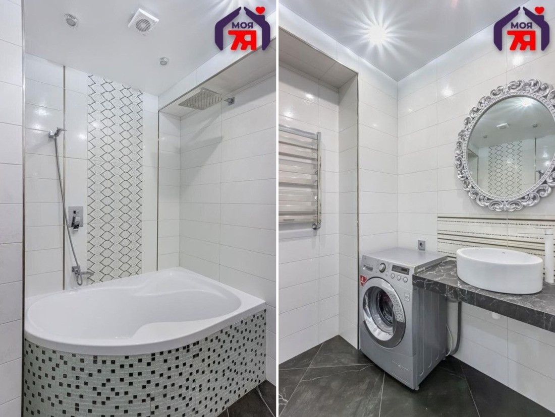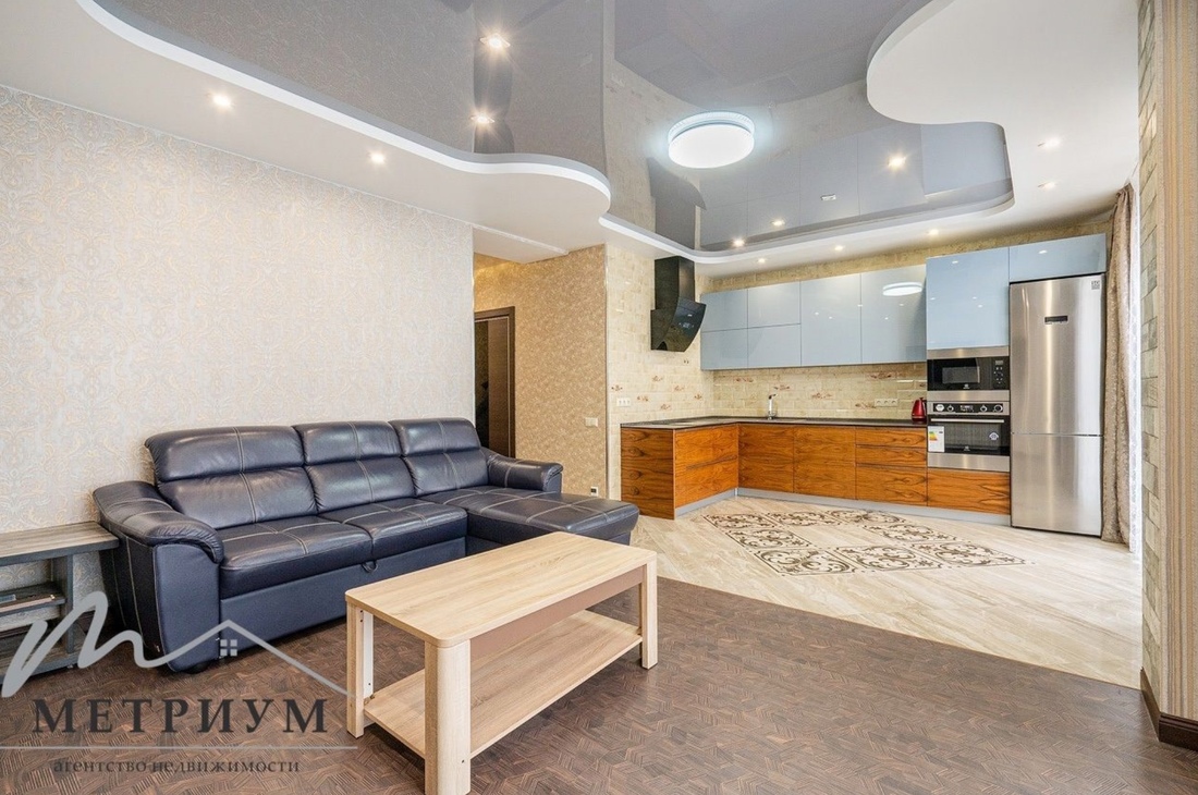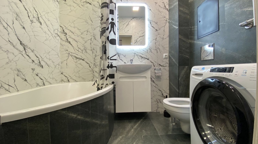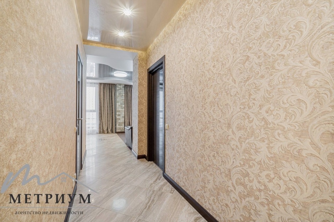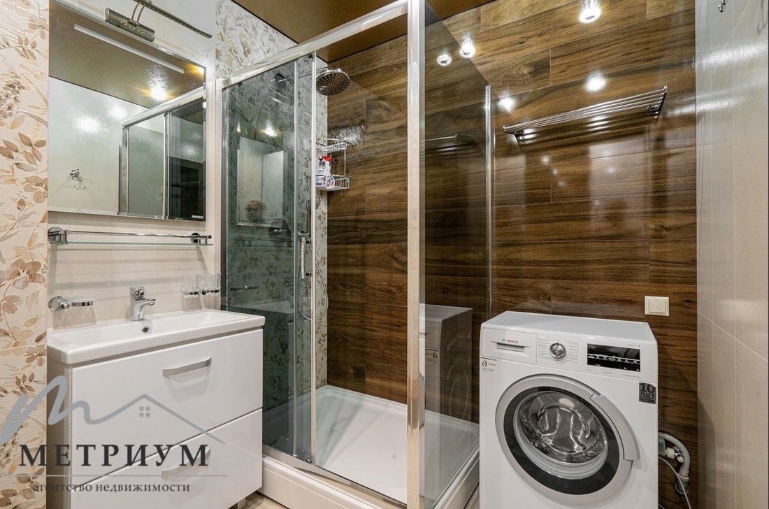 Ну а за $134 000 по курсу собственники готовы расстаться со своей евродвушкой с видом на парк и библиотеку. Площадь у нее значительно больше — 67,2 кв. м. Интерьер немного отдает двухтысячными: глянцевые потолки с подсветкой, кожаная мебель, обои под кирпич (любителям поностальгировать по молодости на заметку). В квартире установлен кондиционер, а еще есть теплые полы, но только в санузле.