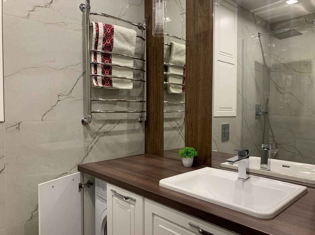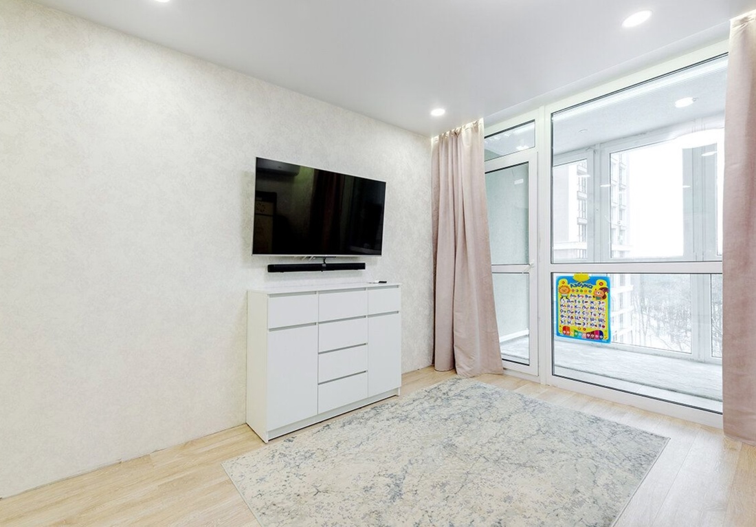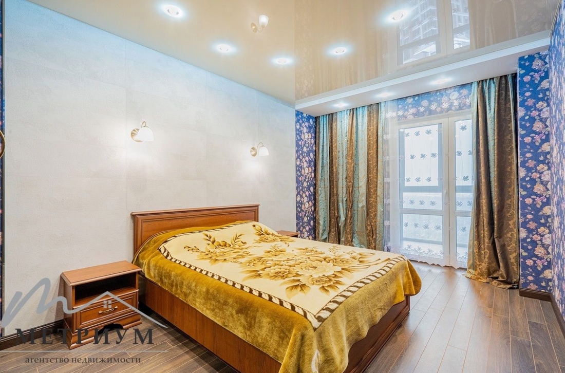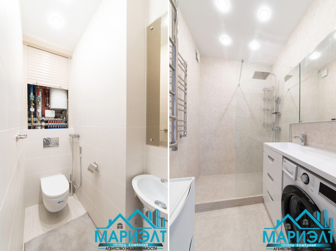Ну а за $134 000 по курсу собственники готовы расстаться со своей евродвушкой с видом на парк и библиотеку. Площадь у нее значительно больше — 67,2 кв. м. Интерьер немного отдает двухтысячными: глянцевые потолки с подсветкой, кожаная мебель, обои под кирпич (любителям поностальгировать по молодости на заметку). В квартире установлен кондиционер, а еще есть теплые полы, но только в санузле.