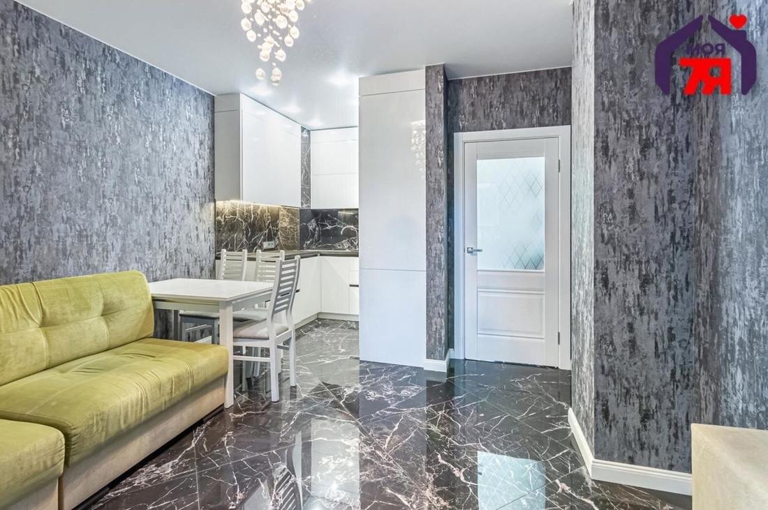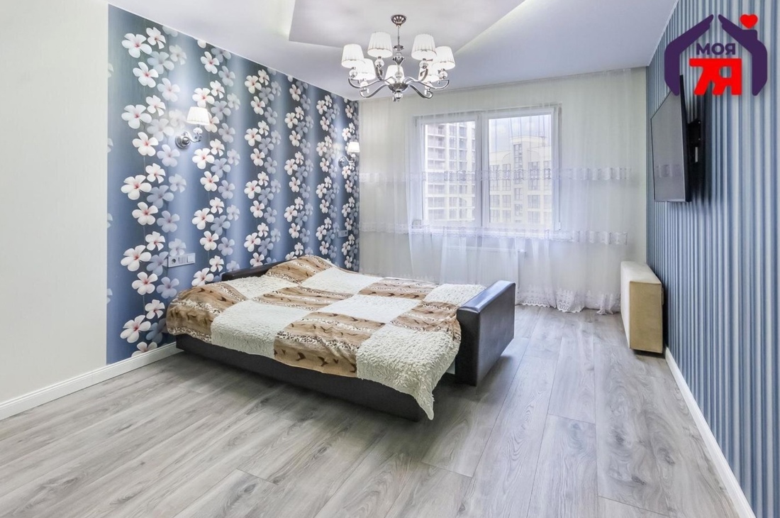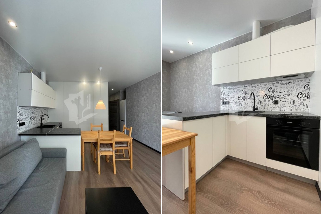 Ну а за 83 350 у. е. можно рассчитывать уже на более классическую однушку с отдельной кухней. Ее размер — 36,8 «квадрата». Интерьер выполнен в светлых тонах. На полу уложены ламинат и плитка под древесину, на стенах — обои в единой стилистике. Интересной особенностью можно назвать нишу в перегородке между кухней и гостиной — видимо, чтобы во время готовки можно было общаться с гостями или другими членами семьи.