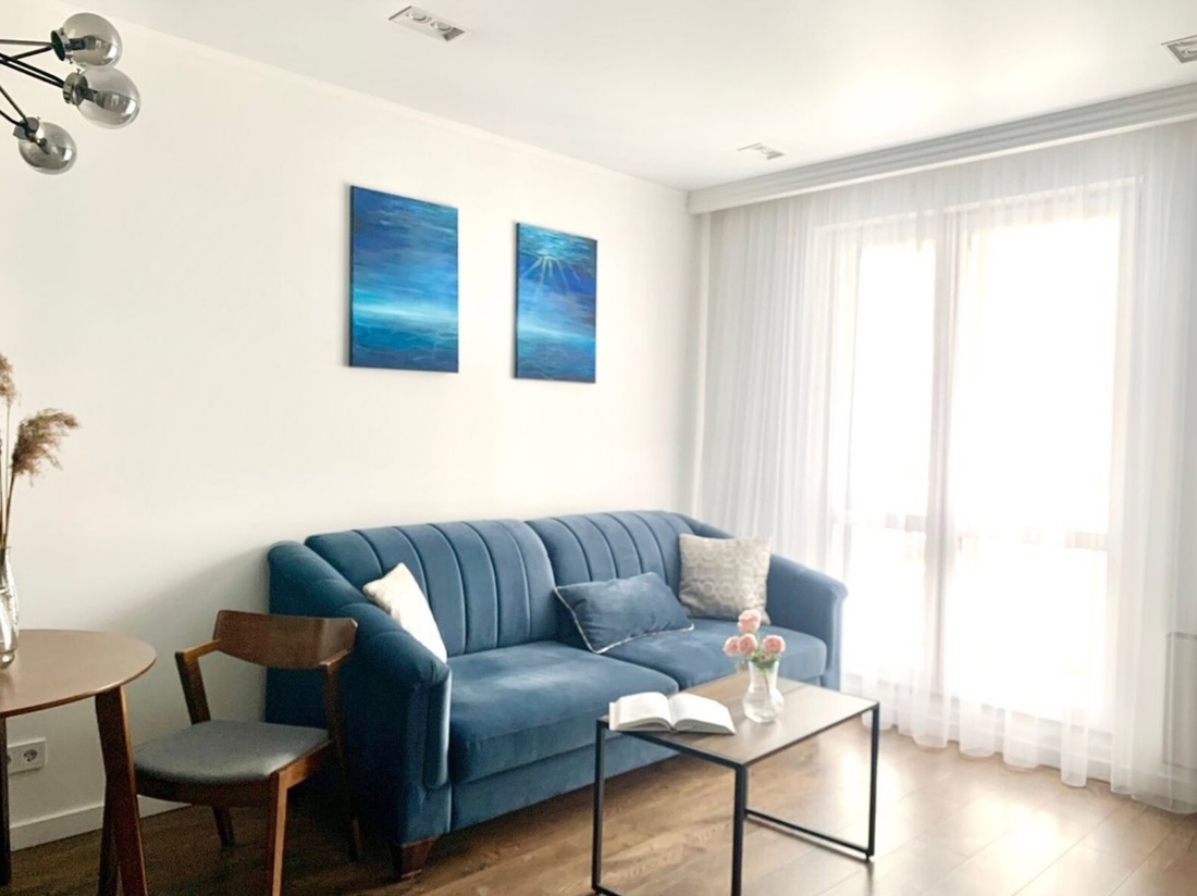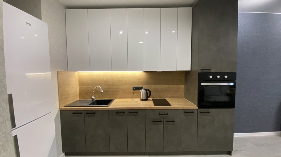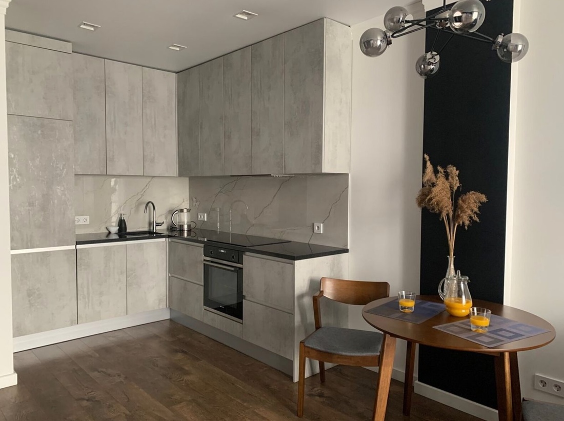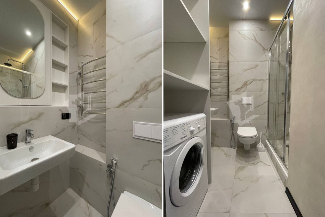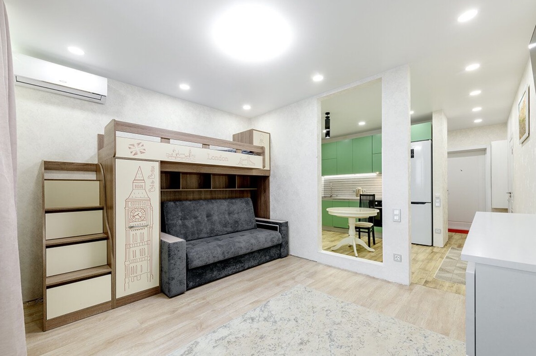 Первый объект по площади несильно отличается от предыдущей категории жилья — тут всего 41,6 кв. м. Состоит из кухни-гостиной, спальни и ванной комнаты. Интерьер аккуратный, без излишеств. Хозяин уверяет, что вся мебель выполнена на заказ.