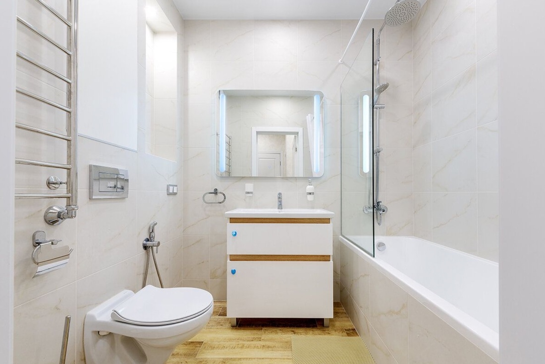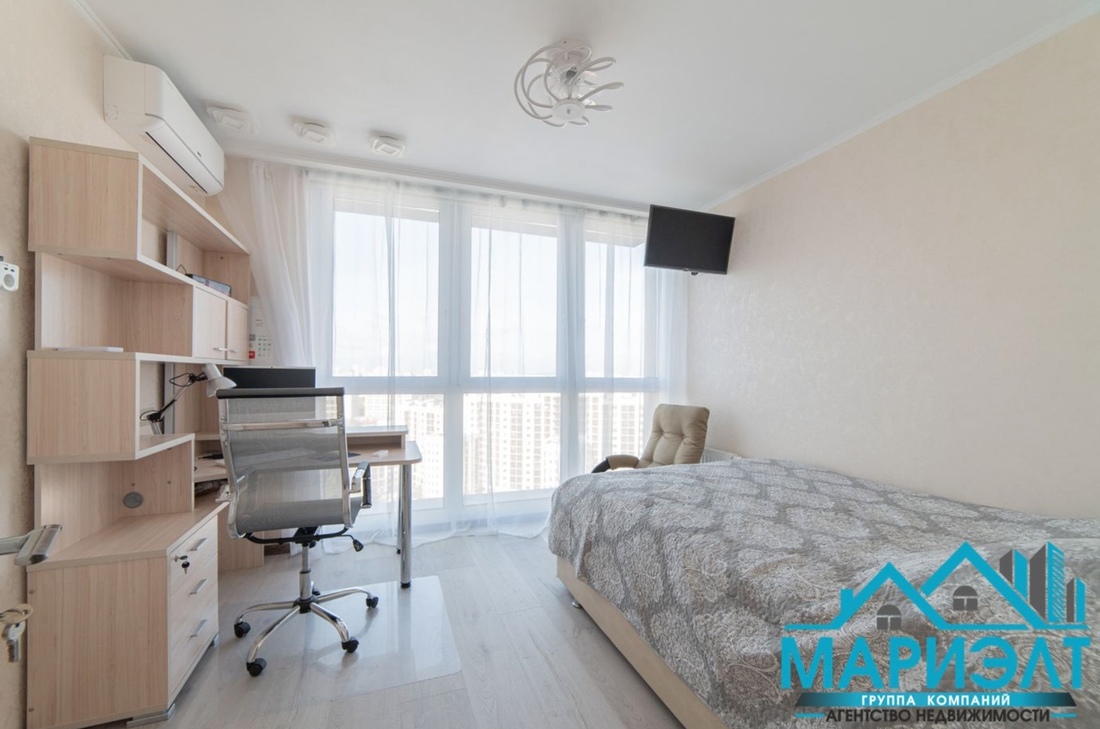 Завершаем нашу подборку трешками. Самый доступный вариант стоит 126 900 у. е. Занимает 66 «квадратов» и включает в себя довольно компактную кухню, переходящую в гостиную, две спальни (в одной из них есть рабочее место) и раздельный санузел. Ремонт, может, и не самый актуальный, но вполне аккуратный: можно смело переезжать и начинать обживаться.