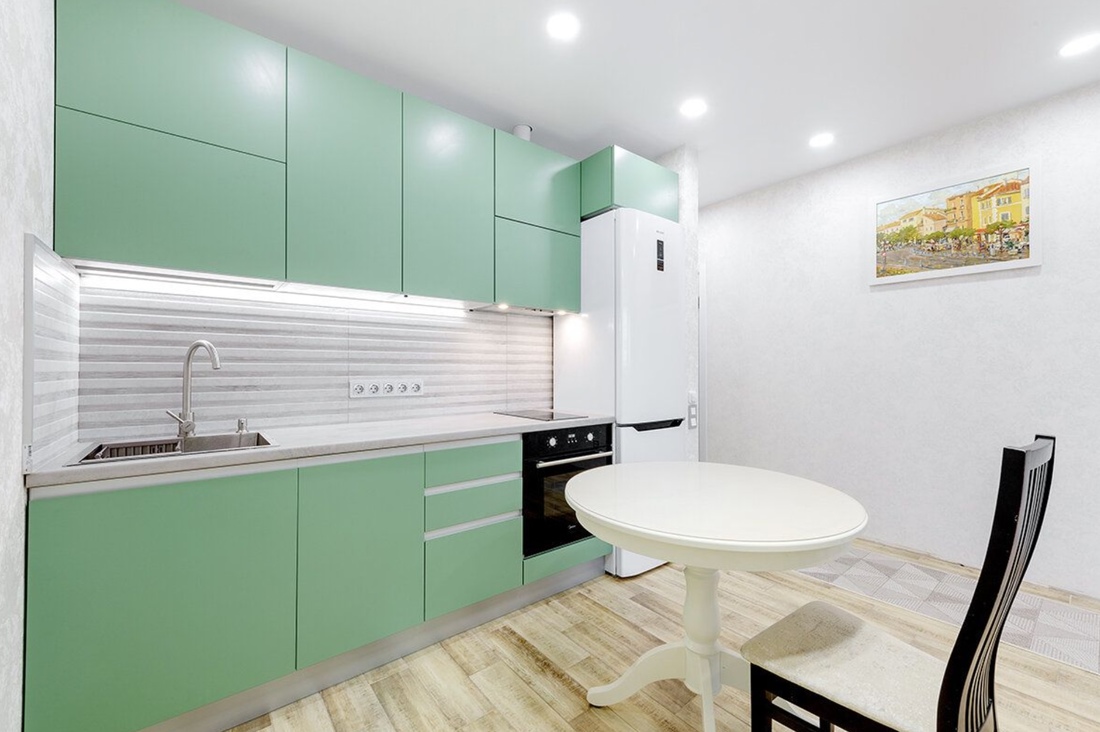 На $3000 больше придется заплатить за квартиру с более интересным ремонтом. Интерьер построен на сочетании контрастных цветов, дополняемых яркими картинами и зеленью (пусть и в виде фартука на кухне). Размер двушки — 52,9 кв. м. На стенах — венецианская штукатурка, на полу — испанский керамогранит. По всей квартире продумано освещение: есть светодиодная подсветка, треки, светильники. Кухня сделана из массива ясеня, имеет всю необходимую встроенную технику. В спальне — кровать с подъемным механизмом и зоной для хранения.