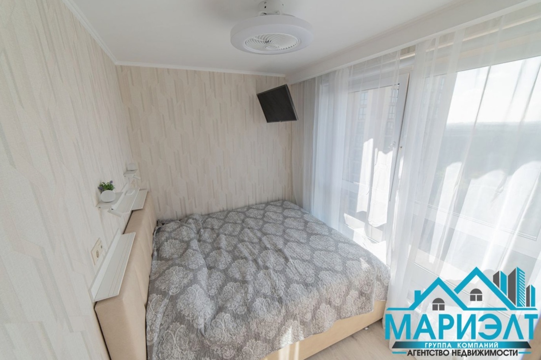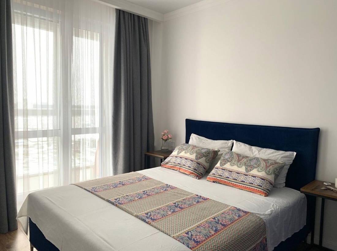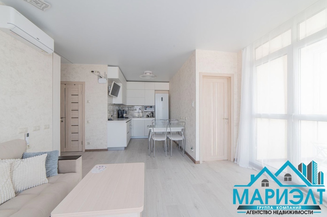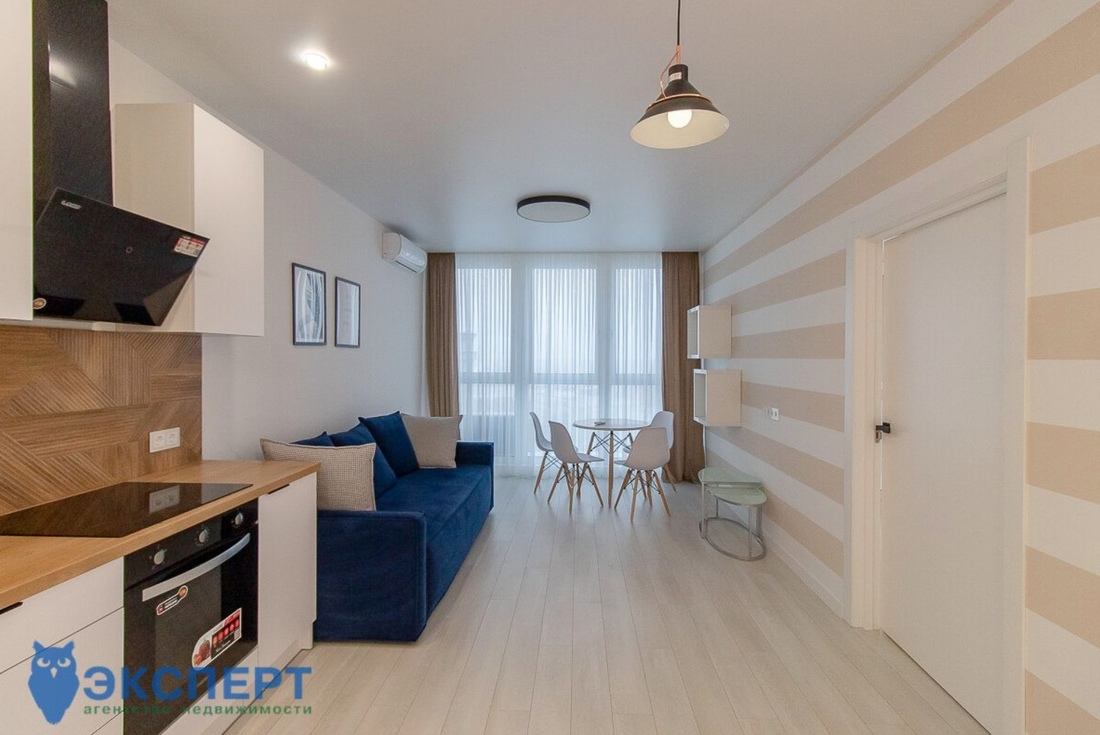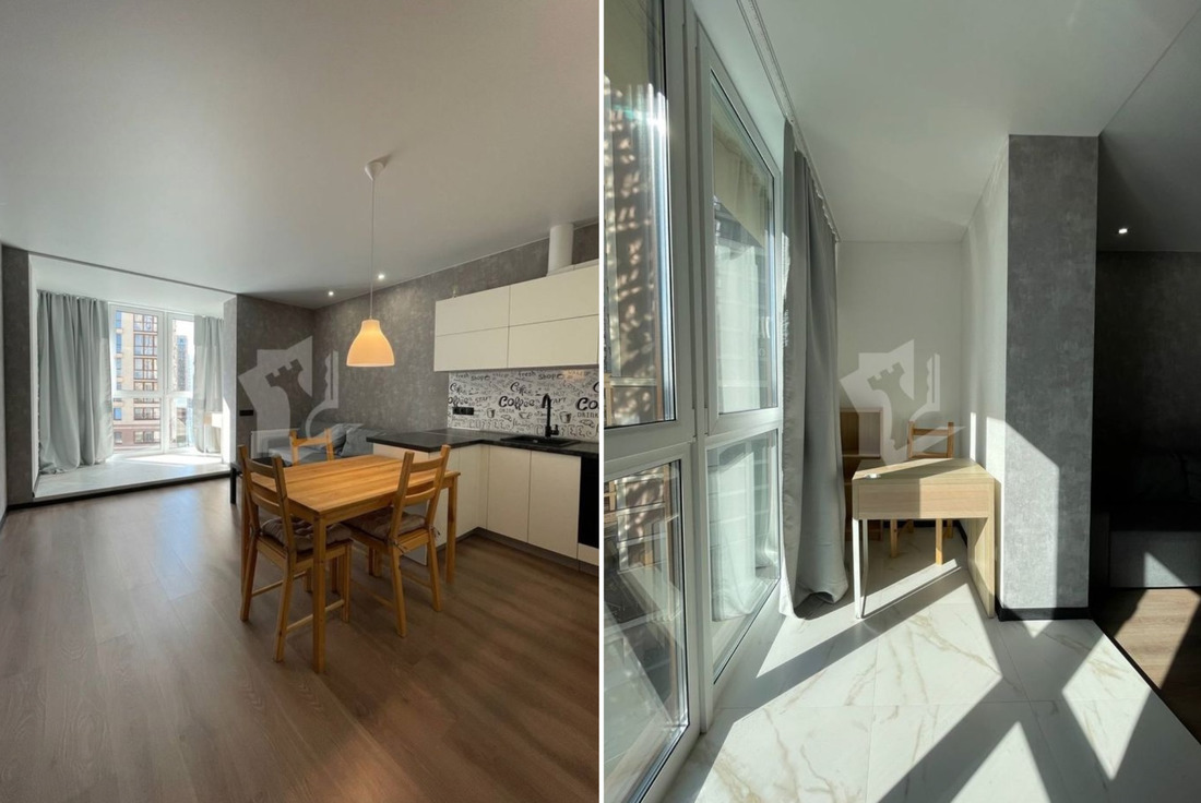 За $68 000 по курсу продается уютная квартира, занимающая 38,4 «квадрата». Прихожая здесь практически отсутствует и сразу переходит в спальню, отделенную от общего пространства шторами. Там же находится шкаф. Дальше мы попадаем на кухню с обеденной группой. Рядом расположена зона гостиной. Также к квартире присоединена лоджия, где организовано небольшое рабочее место. За счет окон в пол в дневное время там всегда много света, так что заниматься своими делами вполне комфортно.