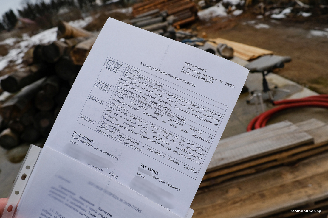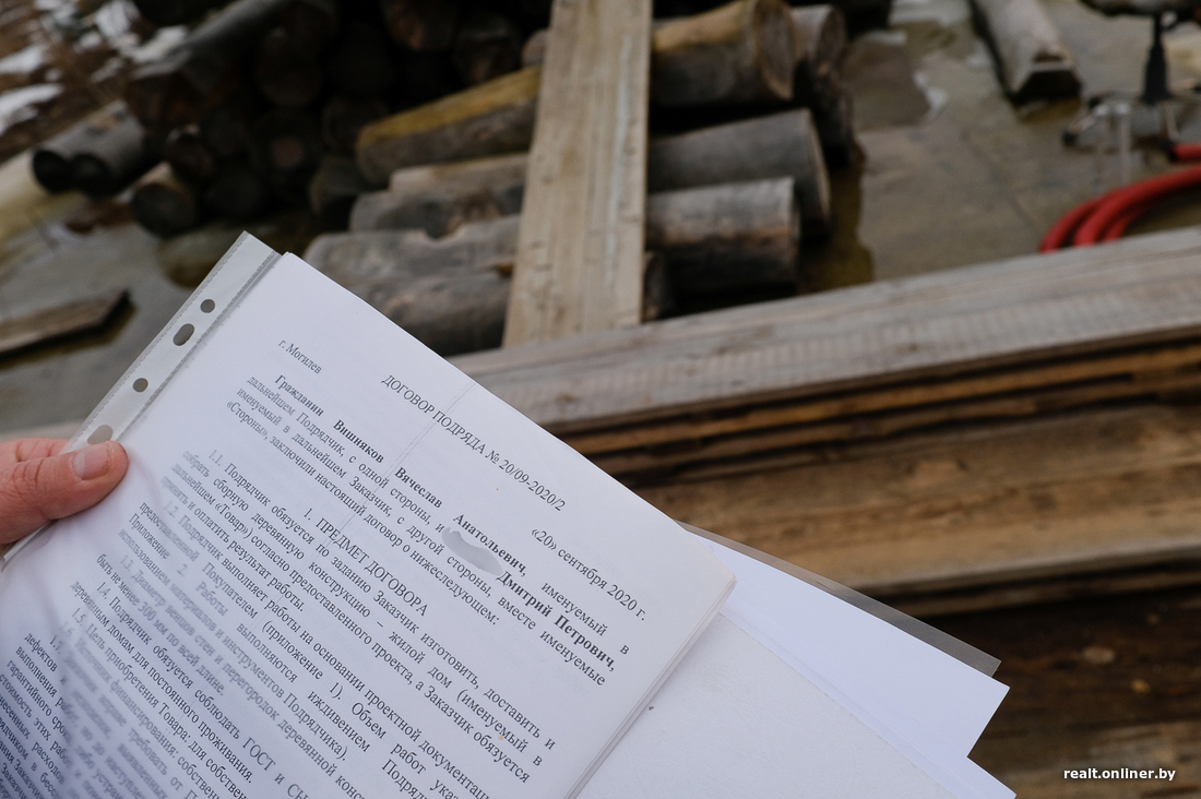 — Сошлись на том, что к работе он приступит в ноябре 2020-го, к февралю следующего года сруб должен был быть собран на его площадке, а в конце апреля — стоять уже у меня на участке. Конечно, мы все время поддерживали связь: он присылал какие-то фото с площадки, я тоже периодически заезжал в Могилев. На моих глазах Вячеслав завершил масштабный и красивый объект для белорусского загородного комплекса. То есть оснований сомневаться в нем у меня не было: толковый мужик.
