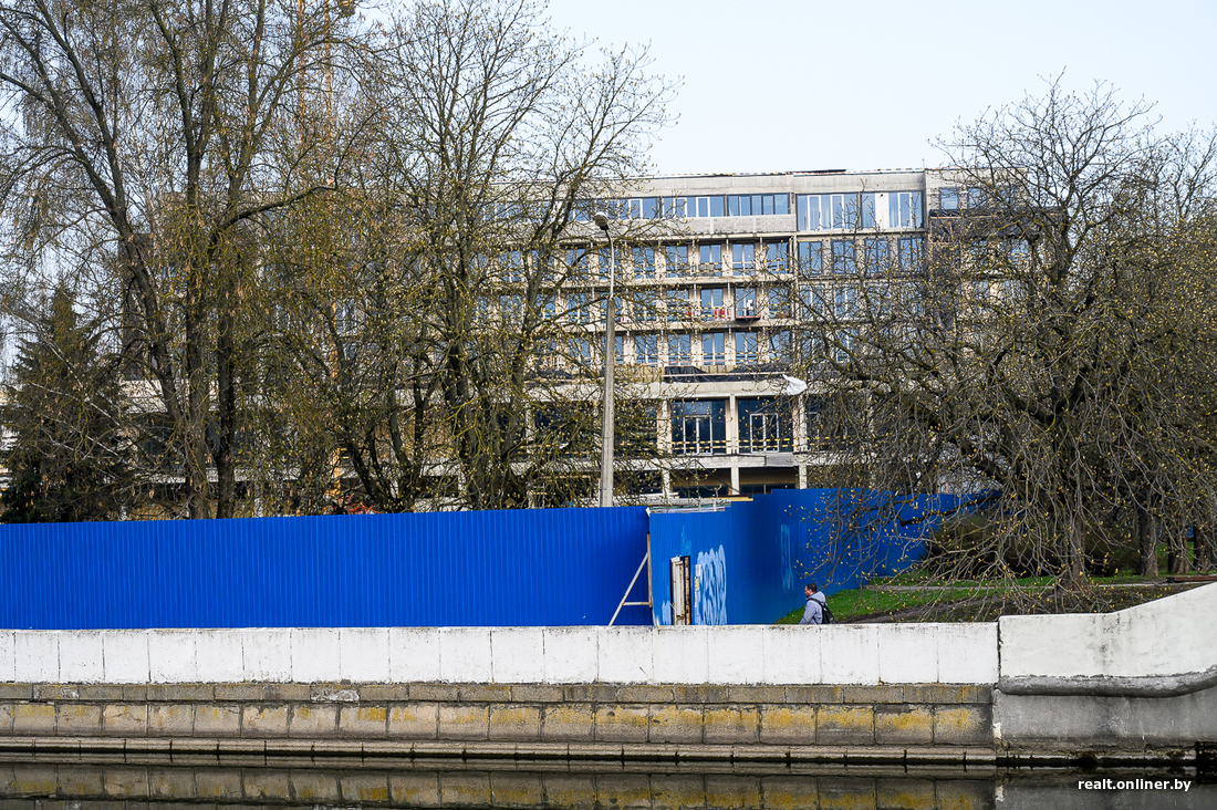 Здание поменьше — будущий ресторан. Часть сооружения поднята на пилонах и нависает над рекой, так что объект действительно может получиться нетривиальным для Минска. Правда, степень готовности этой части комплекса куда меньше.