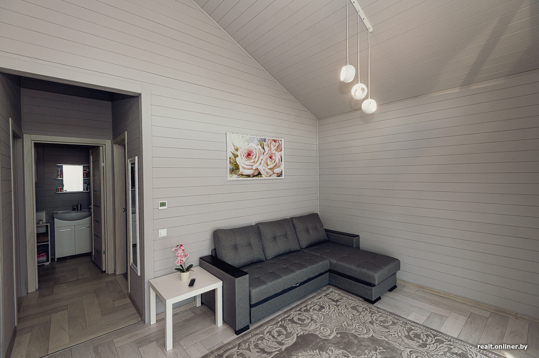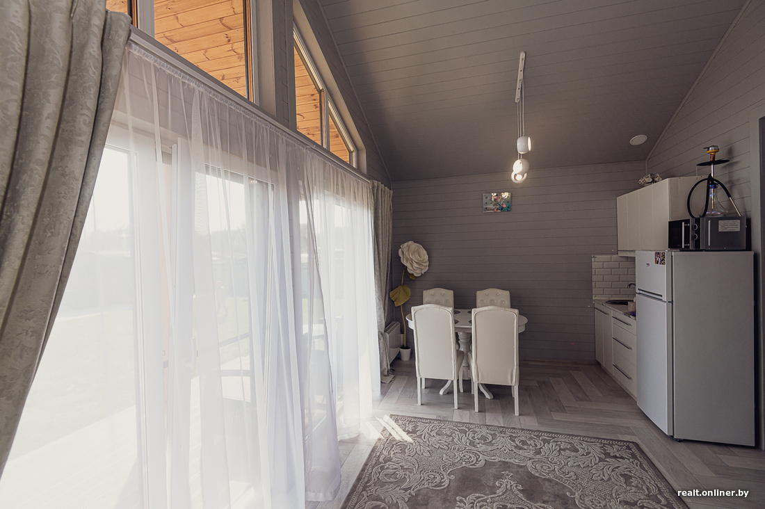 Говорит, без нее загородный дом — не дом. Мол, пусть лучше лишней комнаты не будет, но терраса — обязательно. В итоге дача состоит из 18-метровой гостиной с огромным окном, 9-метровой спальни, санузла, коридора и «царь-террасы» на почти 12 «квадратов».