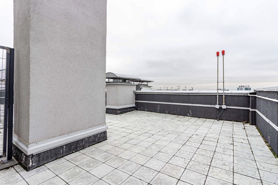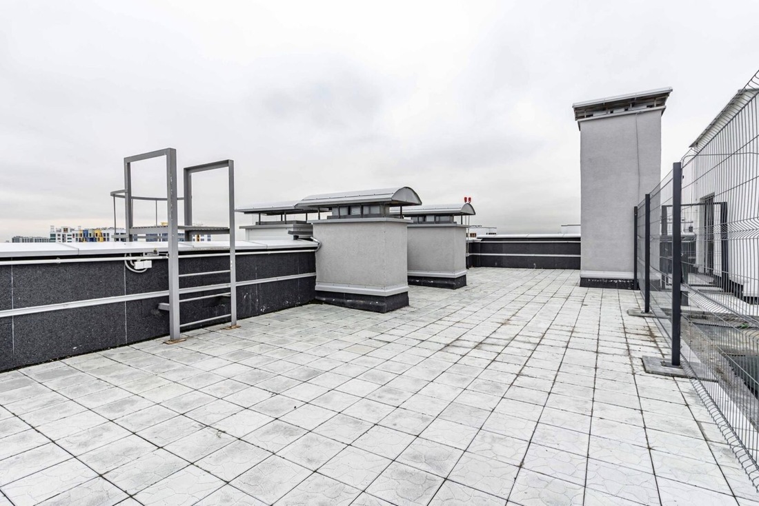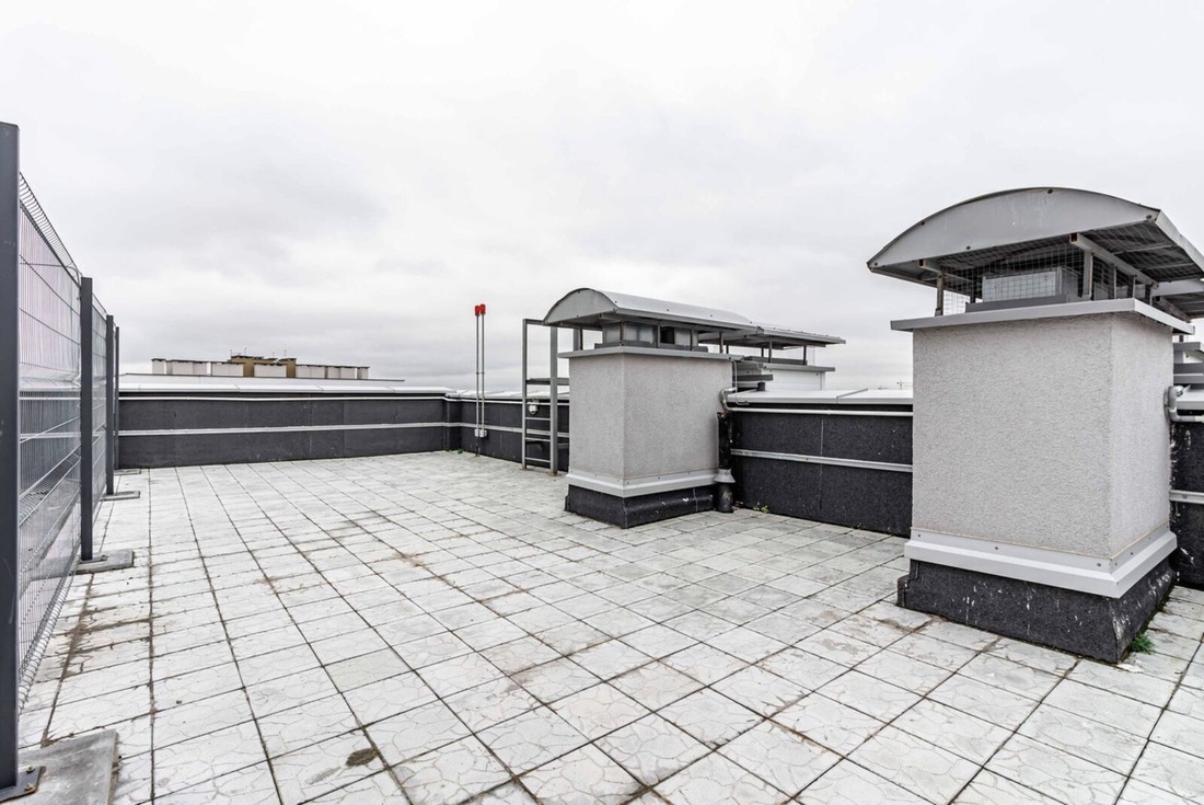 Главная фишка квартиры, конечно же, терраса. В нашем случае она имеет площадь почти 82 квадратных метра. Уличная территория не обустроена (только плитка на полу уложена), но потенциал у этого пространства точно есть: замаскируй технический заборчик вечнозелеными растениями, установи мебель, повесь гирлянды — и будет красота всем на зависть (и НЛО, кстати, можно встречать).