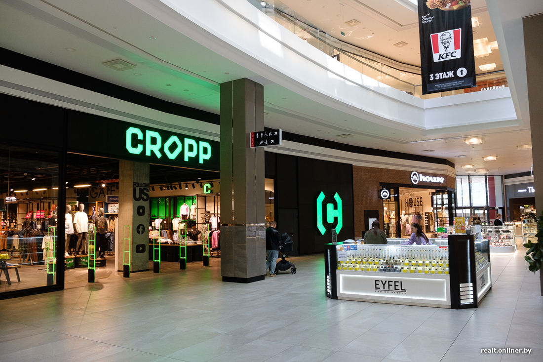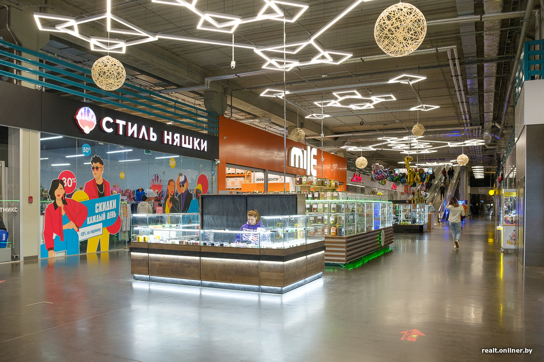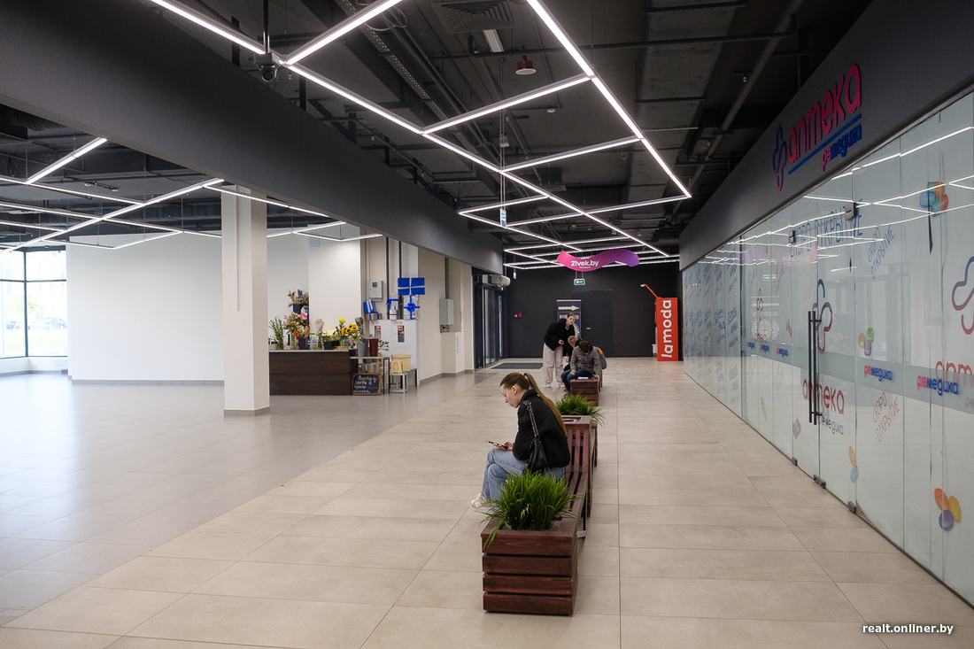 Продуктовый якорный арендатор тут — «Евроопт Прайм». Занавешенные витрины на этажах торгового центра еще встречаются, но это выглядит рабочей ситуацией, так как часть из них обещают открытие конкретных магазинов. Например, Kari.