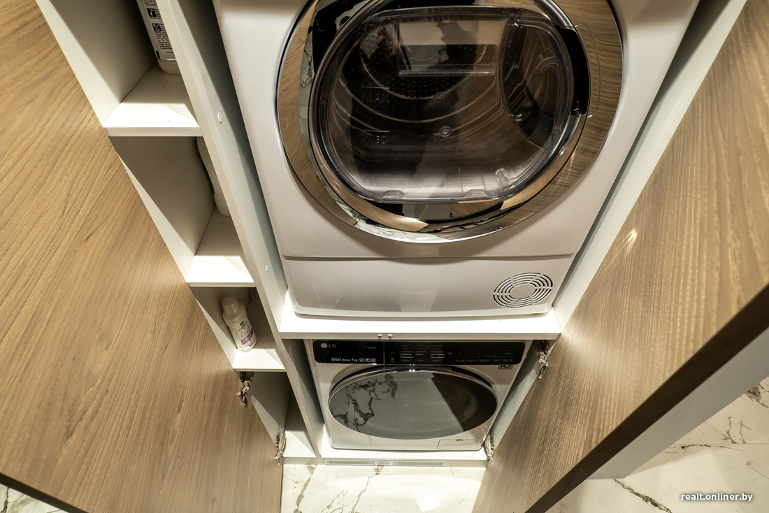 Из коридора можно попасть в гостевой санузел и в полноценную ванную комнату, где нашлось место и для постирочного блока. Везде установлена швейцарская сантехника Laufen.