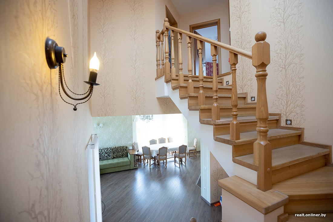 — Строили дом для себя, поэтому на отделке экономить не стали. Обои покупали голландские, дубовую лестницу нам делали на заказ опытные мастера, сауна также выполнена из высококачественной липы и абаша — специального африканского дерева, которое используется для строительства бани. Изначально топили печь дровами, потом установили электрокотлы, сейчас же в обоих домах проведено газовое отопление.