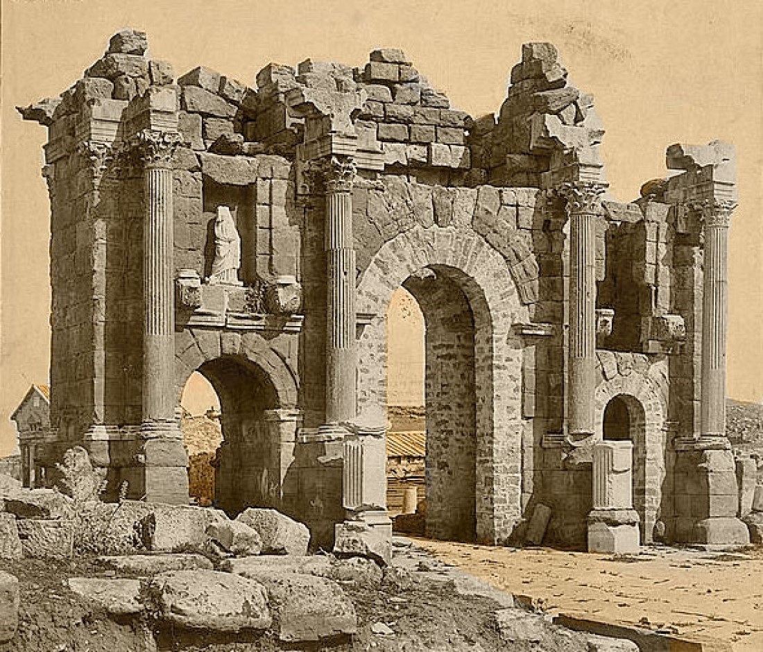 Продолжив изучение окрестностей, члены отряда, в число которых входил и создатель манускрипта, нашли мощеную (!) дорогу, проходившую через горы и приведшую в большой, но безжизненный (причем оставленный, видимо, довольно давно) город. Вход в поселение был отмечен монументальной тройной аркой «великой высоты», причем центральная из них была украшена некими надписями. Судя по описанию, данное сооружение напоминало свои античные аналоги, например монументальные арки в ныне сирийской Пальмире, алжирском Тимгаде или ливанском Тире.
