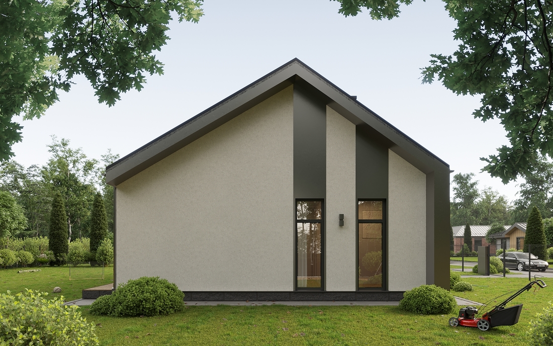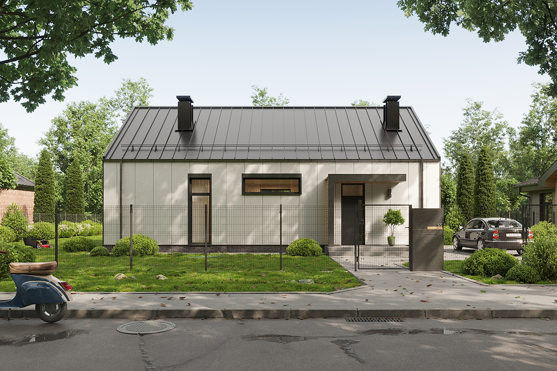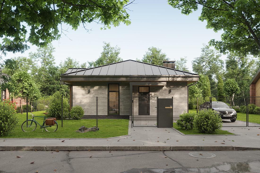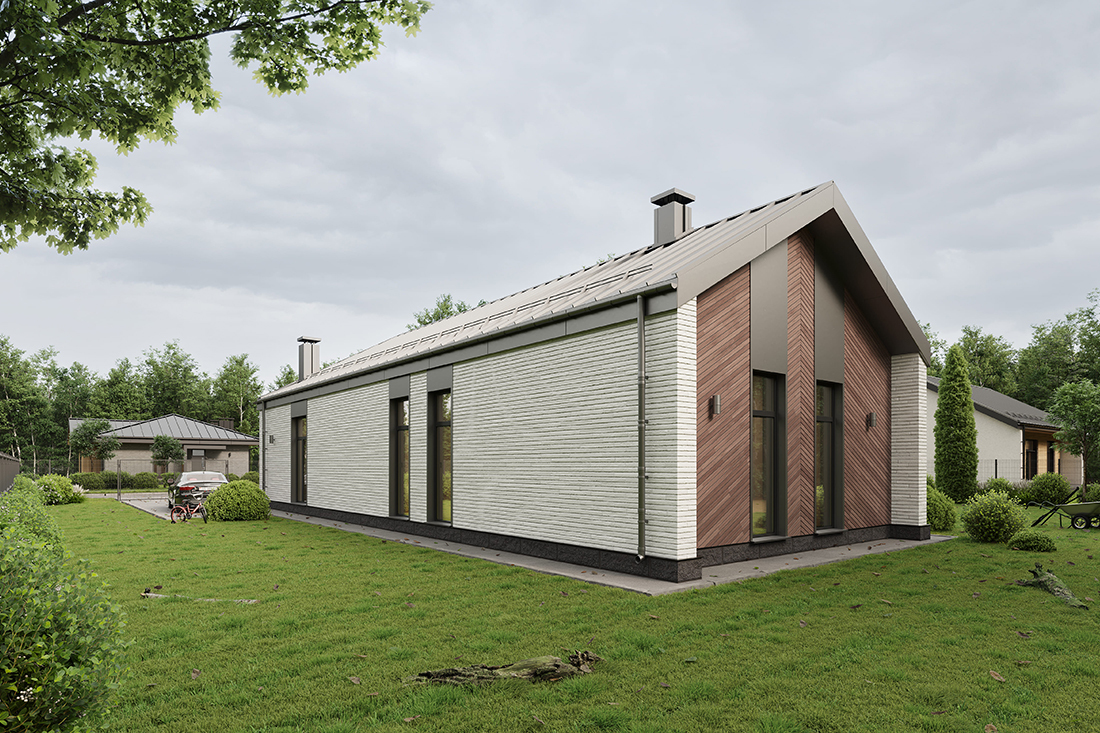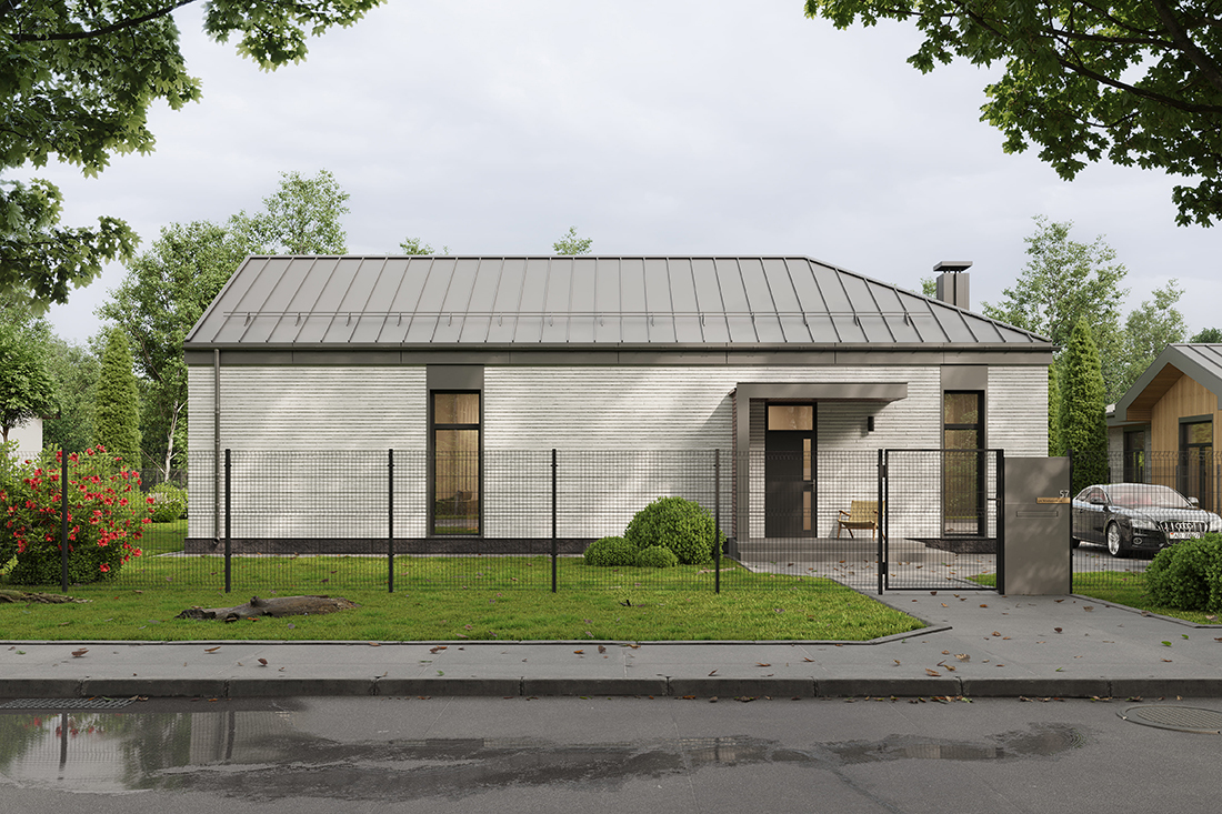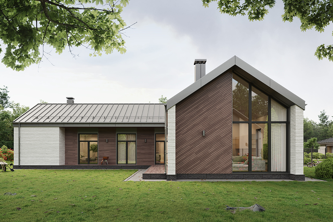 — Площадь такого объекта — 164 квадратных метра. Этот тип дома возник исходя из запросов клиентов: люди хотели видеть что-то одноэтажное, не слишком просторное, но при этом очень уютное и позволяющее скрыться от глаз посторонних. Так и возникла идея создать L-образный дом, который будет развернут во внутренний двор. Стены коттеджа выступают своеобразным «забором», за которым не будет видно, что происходит на внутренней территории.