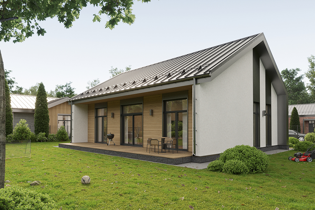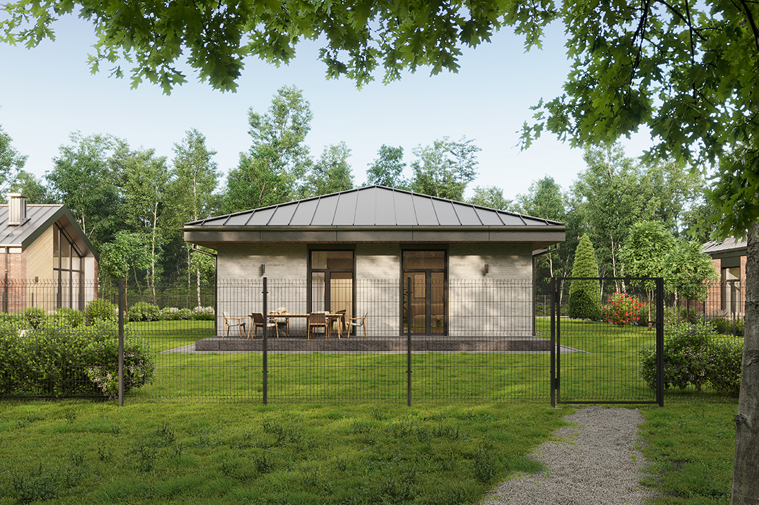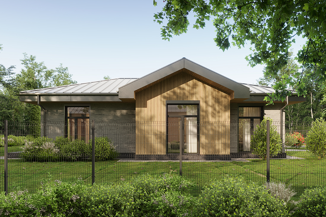 Следующий дом уже просторнее: это одноэтажный коттедж на 138 квадратных метров. Такой тип дома назвали «трансформером»: по умолчанию в нем заложены две обособленные спальни и кухня-гостиная, совмещенная с третьей жилой комнатой. Притом ее, жилую комнату, можно отделить перегородкой от кухни-гостиной, получив еще одно изолированное помещение.