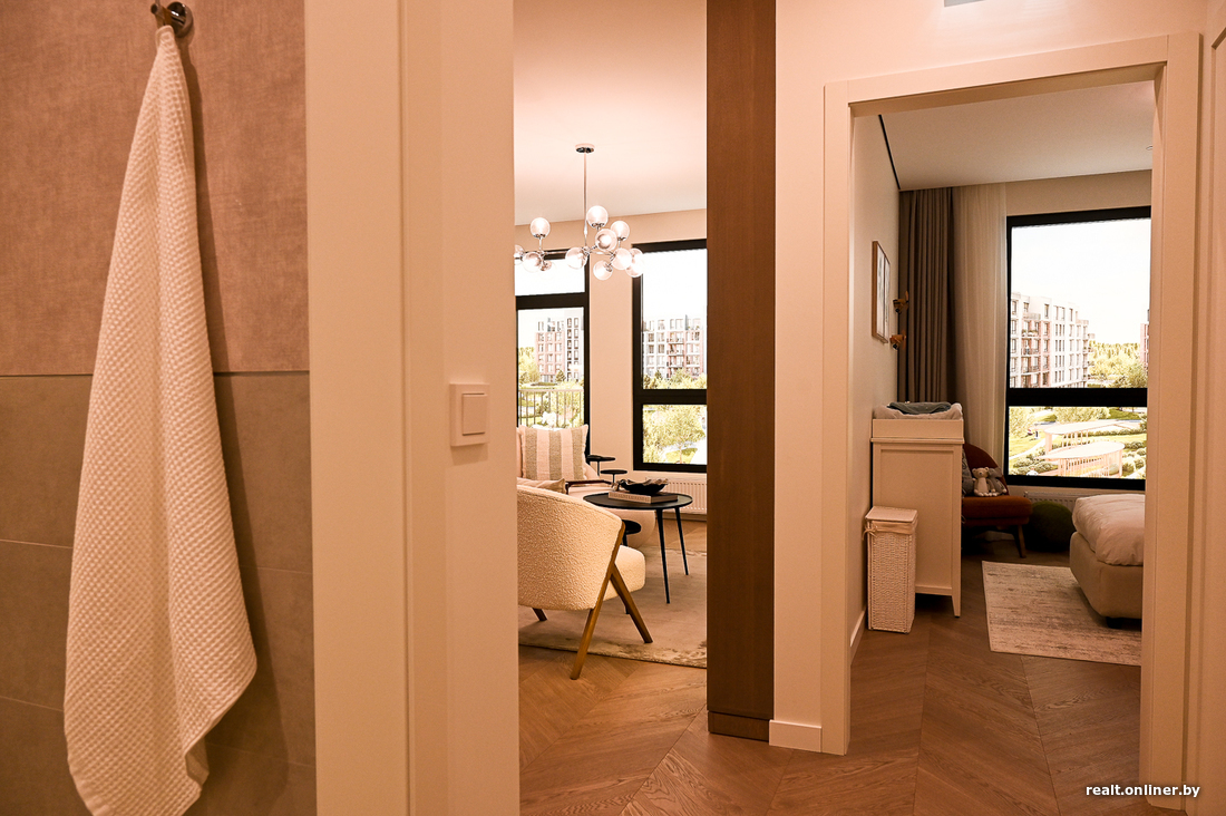 Сначала попадаешь как бы в лобби дома в квартале, потом — на этаж. И заходишь в квартиру: там кухня с гостиной, спальня, детская комната, санузел, постирочная, гардероб.